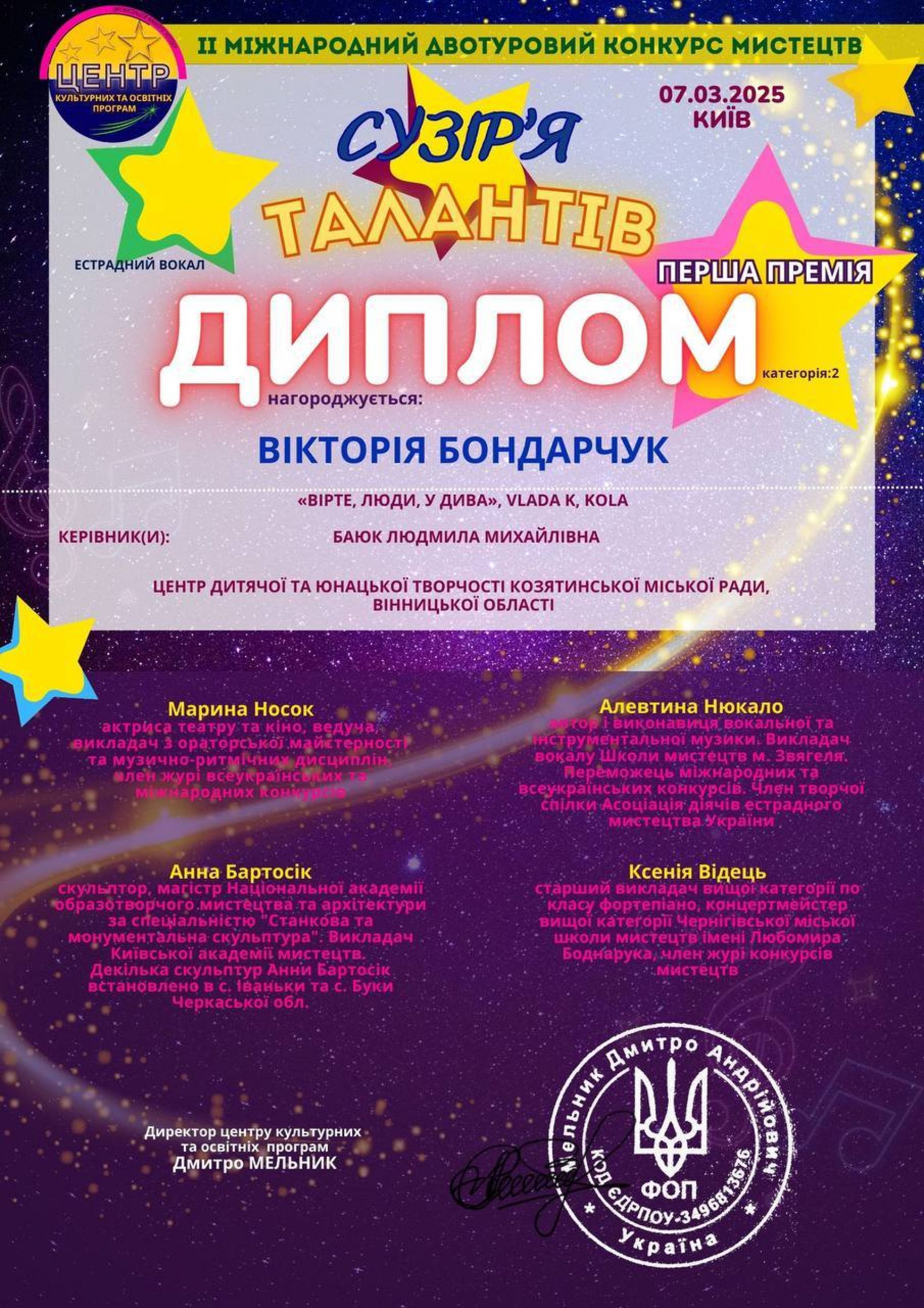 Має перемогу і вихованка гуртка «Колектив естрадної пісні» Вікторія Бондарчук, керівник Людмила Баюк. Дівчина взяла участь у ІІ Міжнародному двотуровому конкурсі мистецтв «Сузір'я талантів» та здобула І премією в номінації «Естрадний вокал»