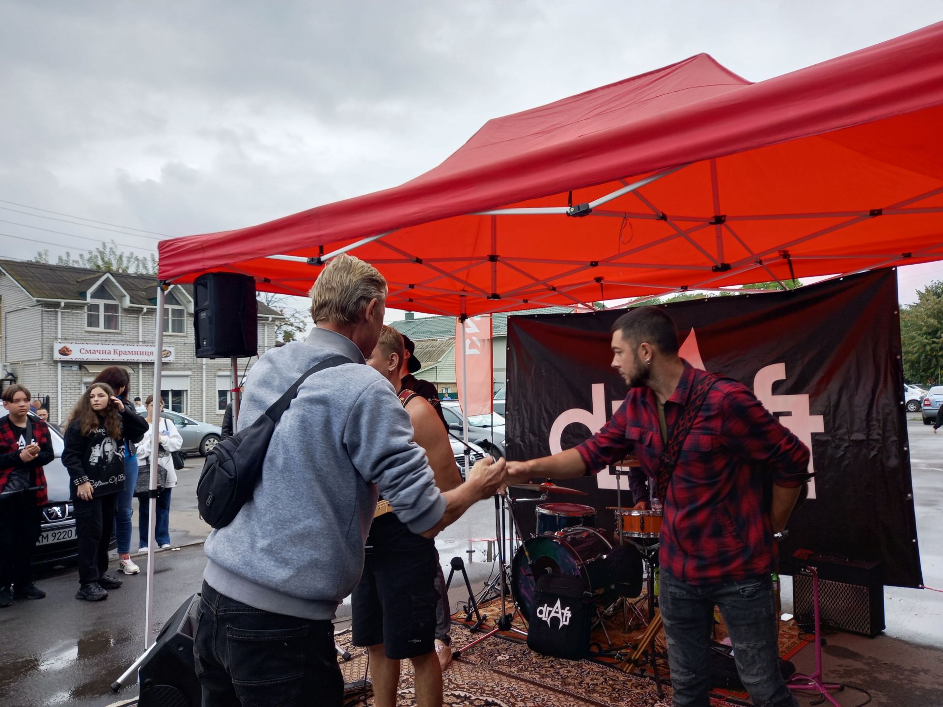 Хлопці зіграли другу пісню на біс. А тоді вокаліст гурту подякував усім, хто прийшов. Поки учасники гурту «Draft» збирали апаратуру, люди не тільки продовжували донатити, а й підходили до музикантів, щоб взяти автограф, зробити фото, купити футболку чи просто обійнятися.
