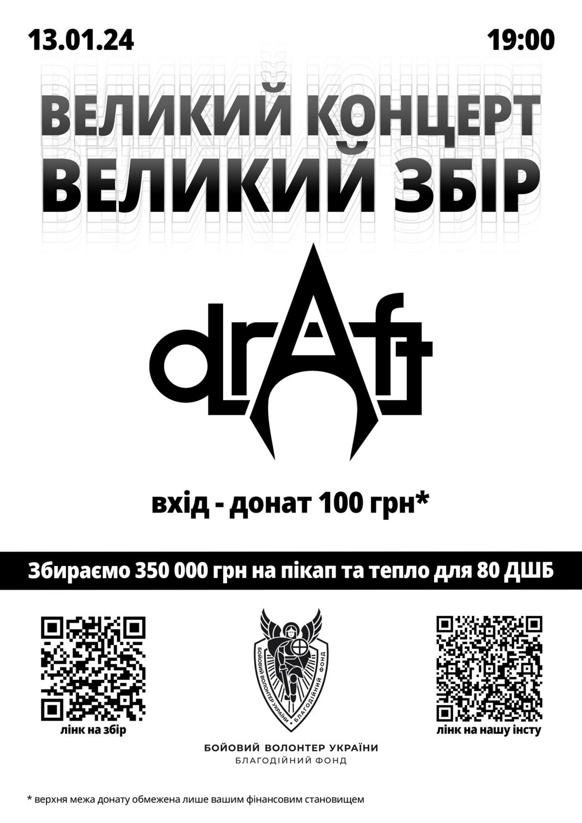 На підтримку збору для 80 Десантно-штурмової бригади «Draft» зіграє у Козятині благодійний концерт. Гурт запрошує усіх у суботу, 13 січня о 19.00 у міський будинок культури. Вхід-донат — 100 гривень. Квитки продаватимуть у день концерту при вході в будинок культури. Усі виручені кошти підуть на закриття збору на авто і буржуйки для десантників. Долучитися і задонатити можна вже зараз, надіславши кошти на картку Монобанк 5375 4112 0913 6253, або за посиланням.