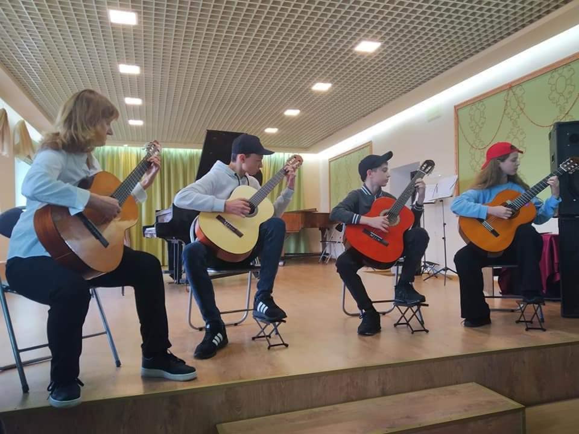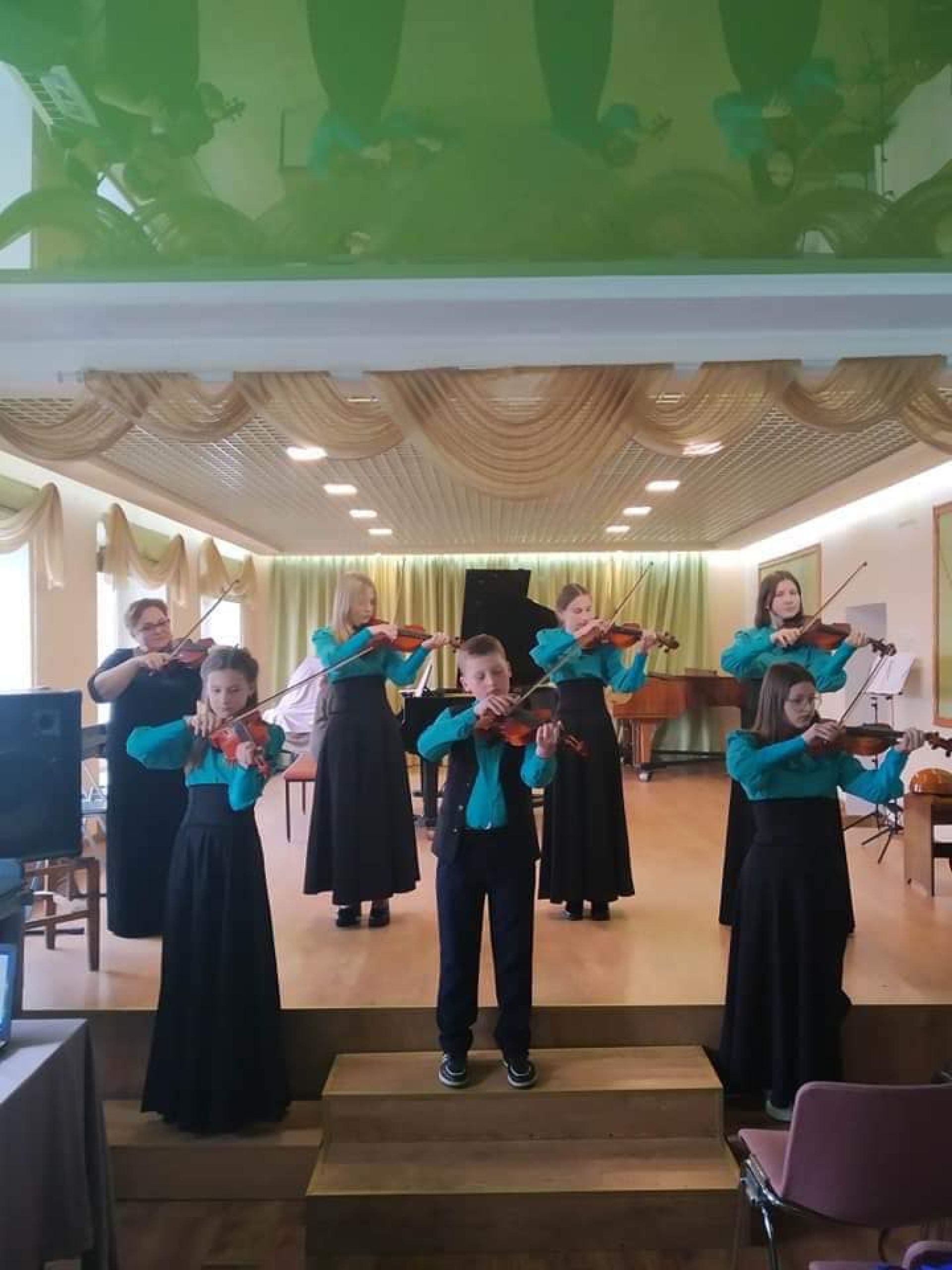 Далі виступав струнно-народний відділ. Прозвучали виступи учнів на гітарі,скрипці та синтезаторі. Чудові номери ансамблю гітаристів та ансамблю скрипалів не залишили в залі байдужих.