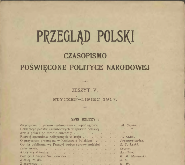 «Przeglad Polski» був у незвичному для нас форматі. Часопис був схожий не на сучасну газету, а швидше на книжку формату А5. На сторінках друкували політичні новини, новини з Польщі, з-за кордону, статті про літературних діячів та навіть афоризми. Становище Польщі під час та після Першої світової війни було основною темою публікацій у 1917 році.