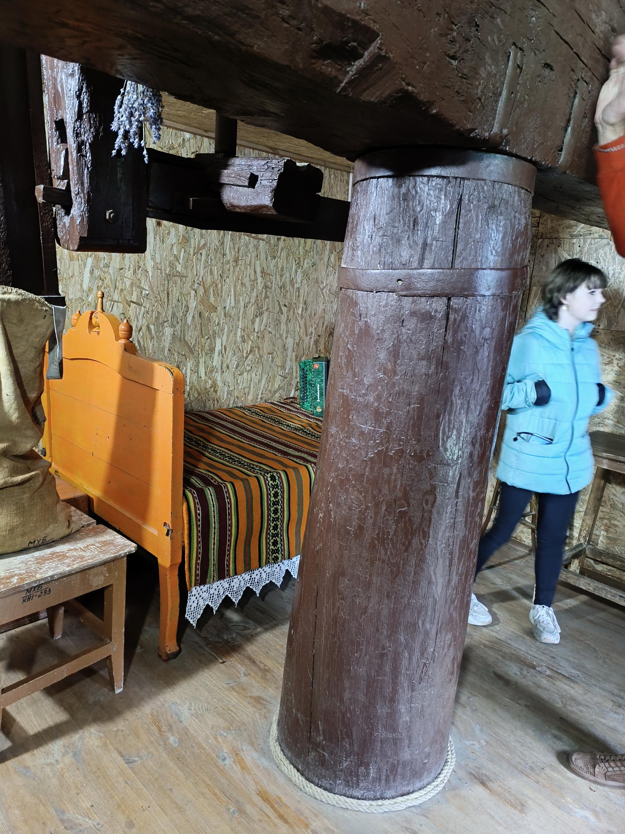 — Ось вісь, прикріплена до крил вітряка, — показує Сергій Рибачук, директор Музею хліба. — Крила крутили велику шестерню, щеплену з валою. Через металевий вал приходив у рух верхній камінь жорна. Коли треба було зупинити вітряк, використовувалося спеціальне гальмо — мотузку, до краю якої прив’язана колода. Вітряк колись не був обшитий, в ньому були отвори. Мельник кидав цю колоду донизу, мотузка натягувалася і гальмувала роботу лопатей.