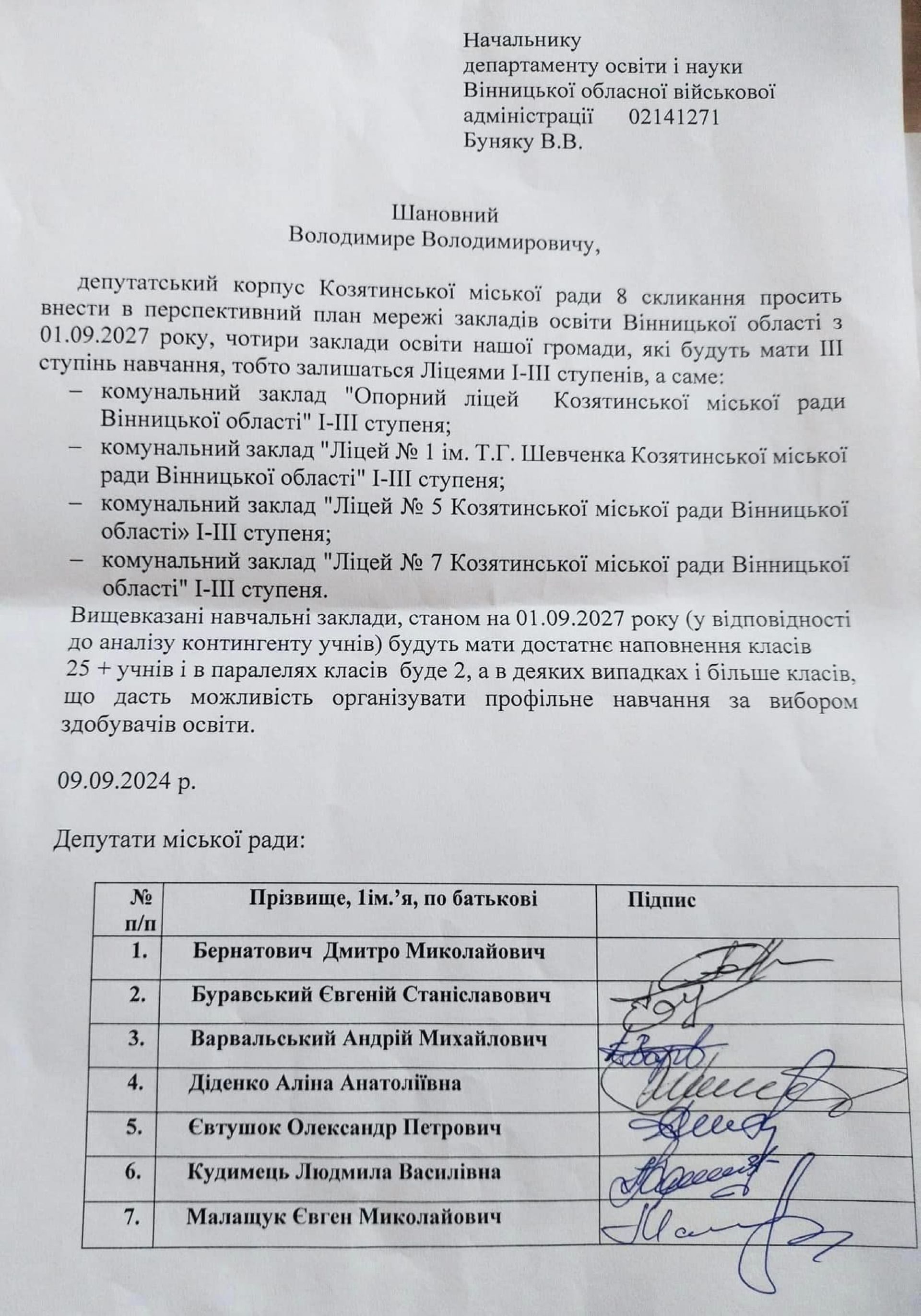 У листі у запропонованому списку вказали Козятинський опорний ліцей, ліцей №1, №5 та №7.