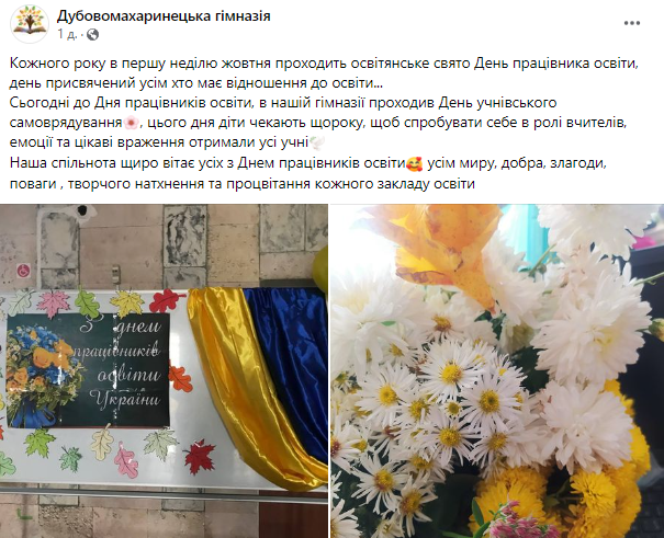 — Дорогі освітяни, прийміть найщиріші привітання з вашим професійним святом!, — йдеться на сторінці Глуховецька середня загальноосвітня школа І-ІІІ ст.
