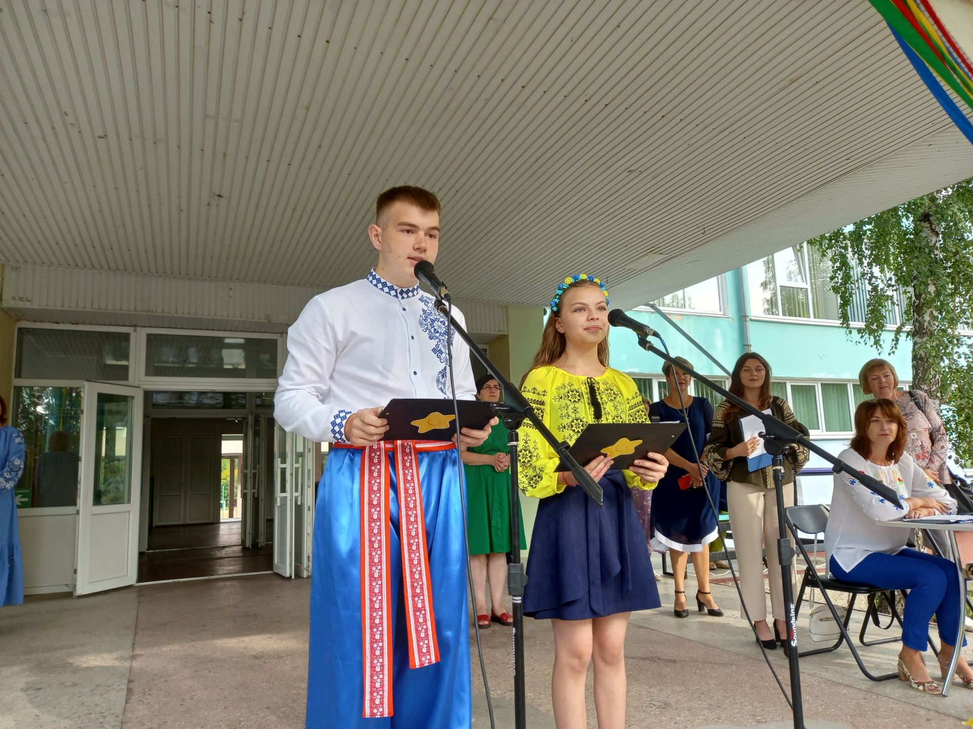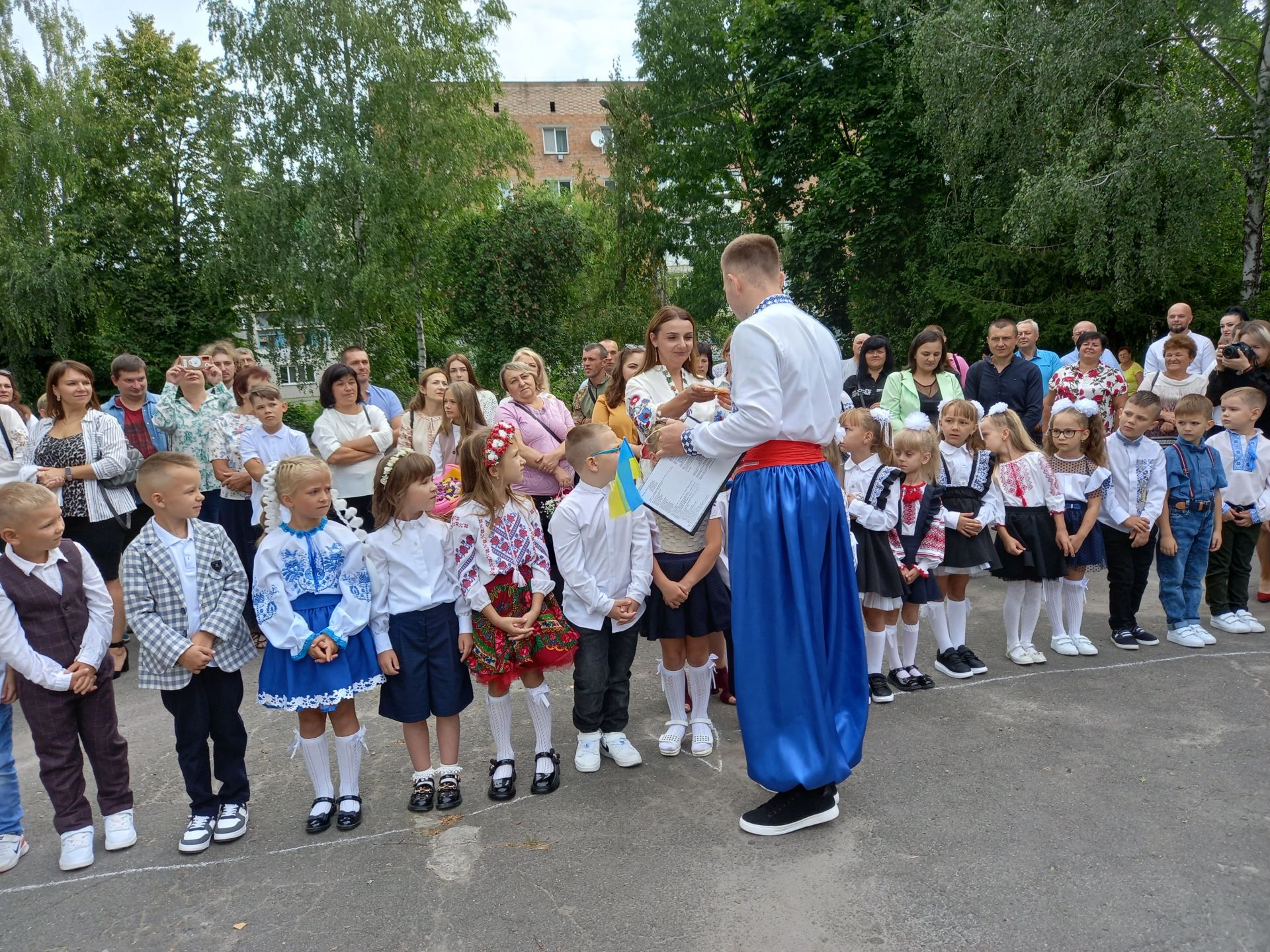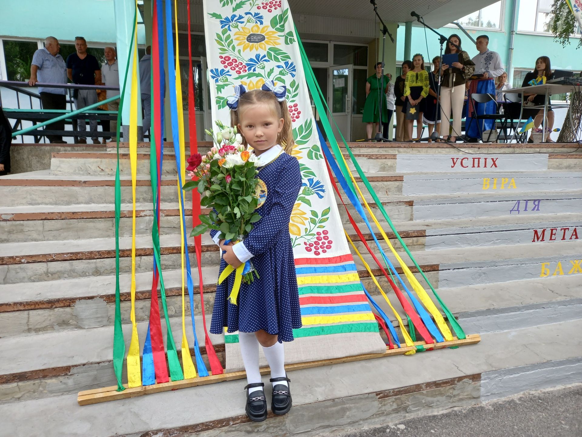 Директор побажала усім миру та міцного здоров’я. А тоді на імпровізованій сцені з’явилися Фея добрих справ та козак Залізняк. Вони мали особливу місію — привітати першокласників і передати їм чарівні зірки, які приносять добро та радість.