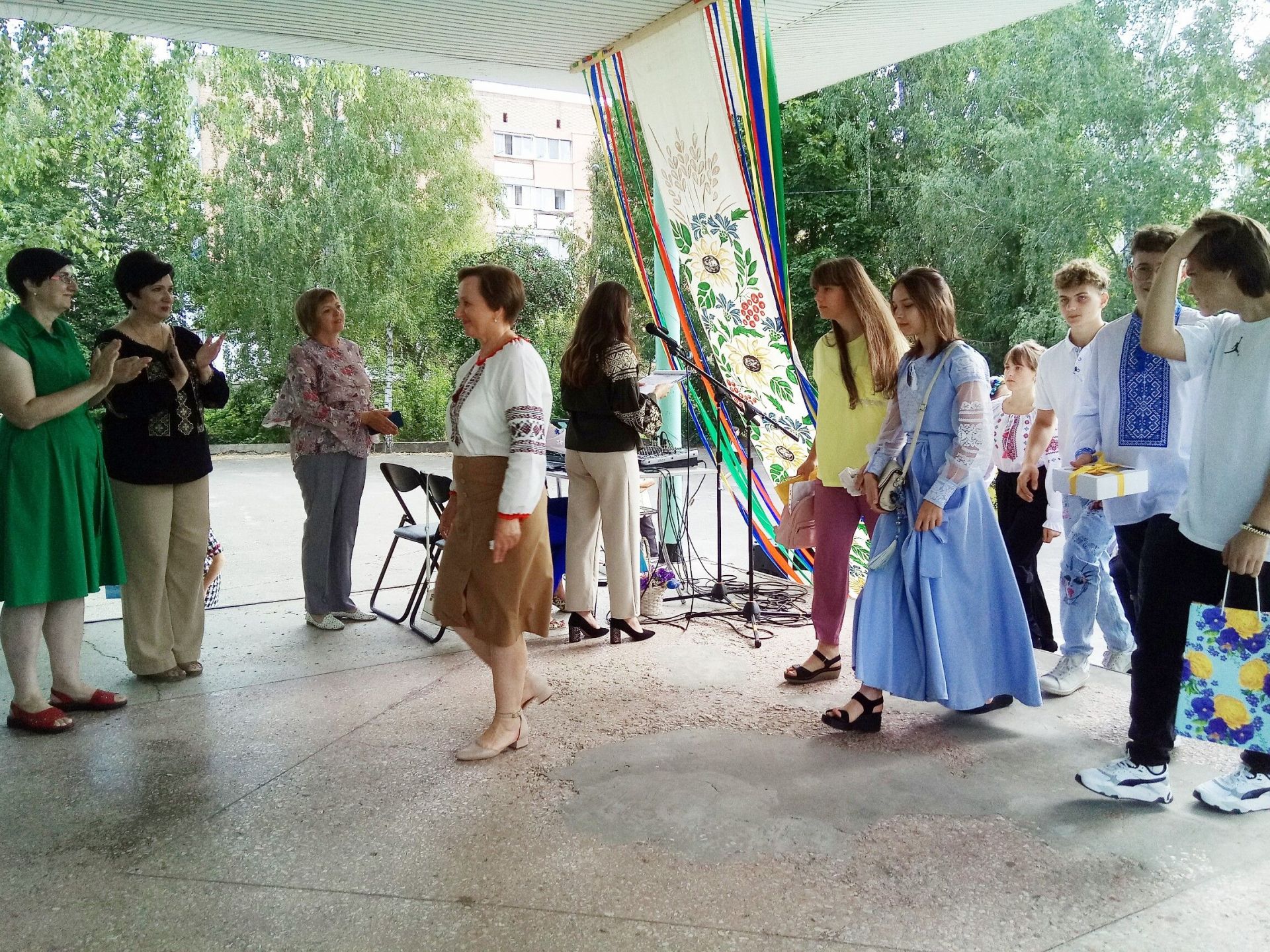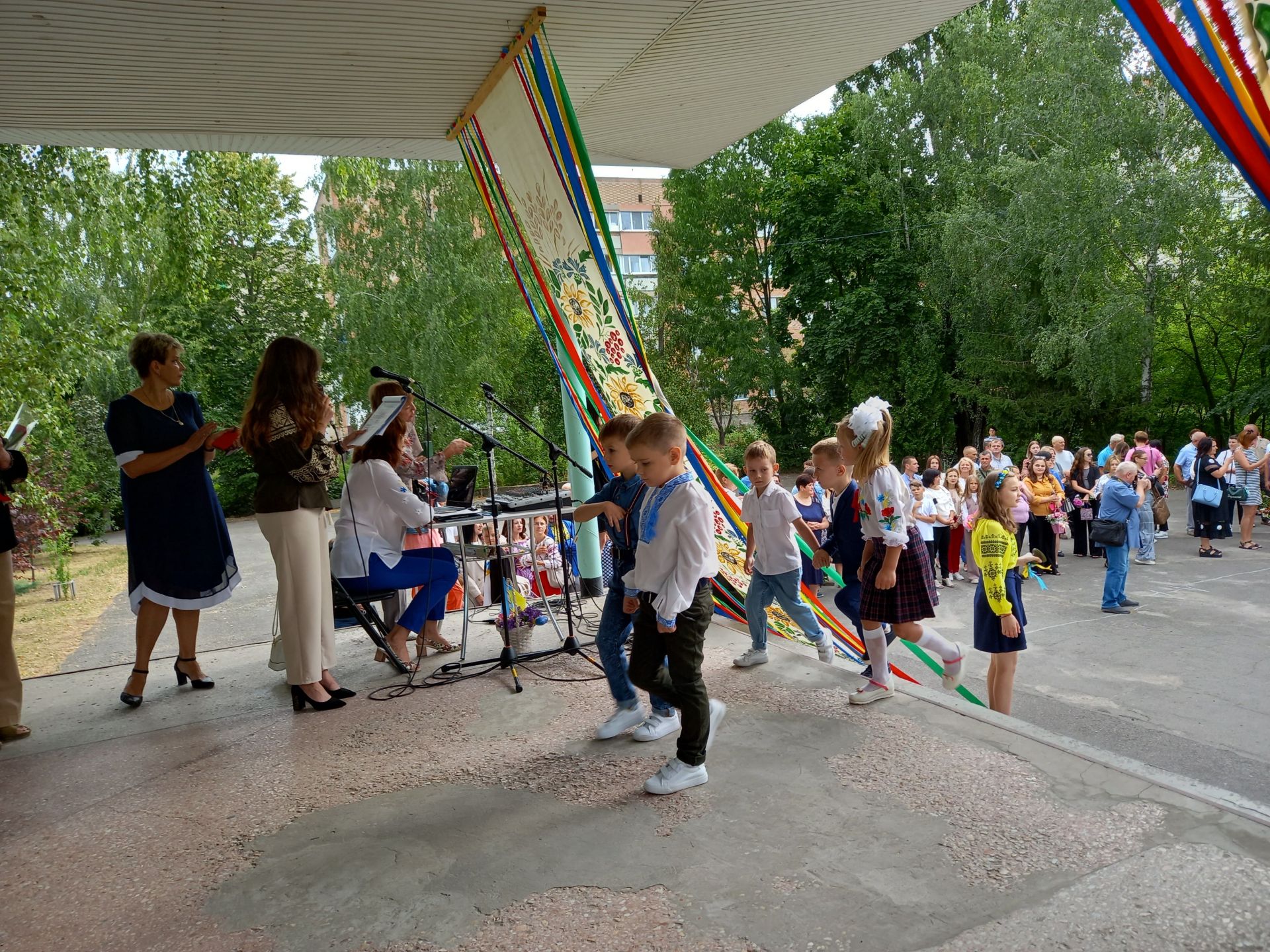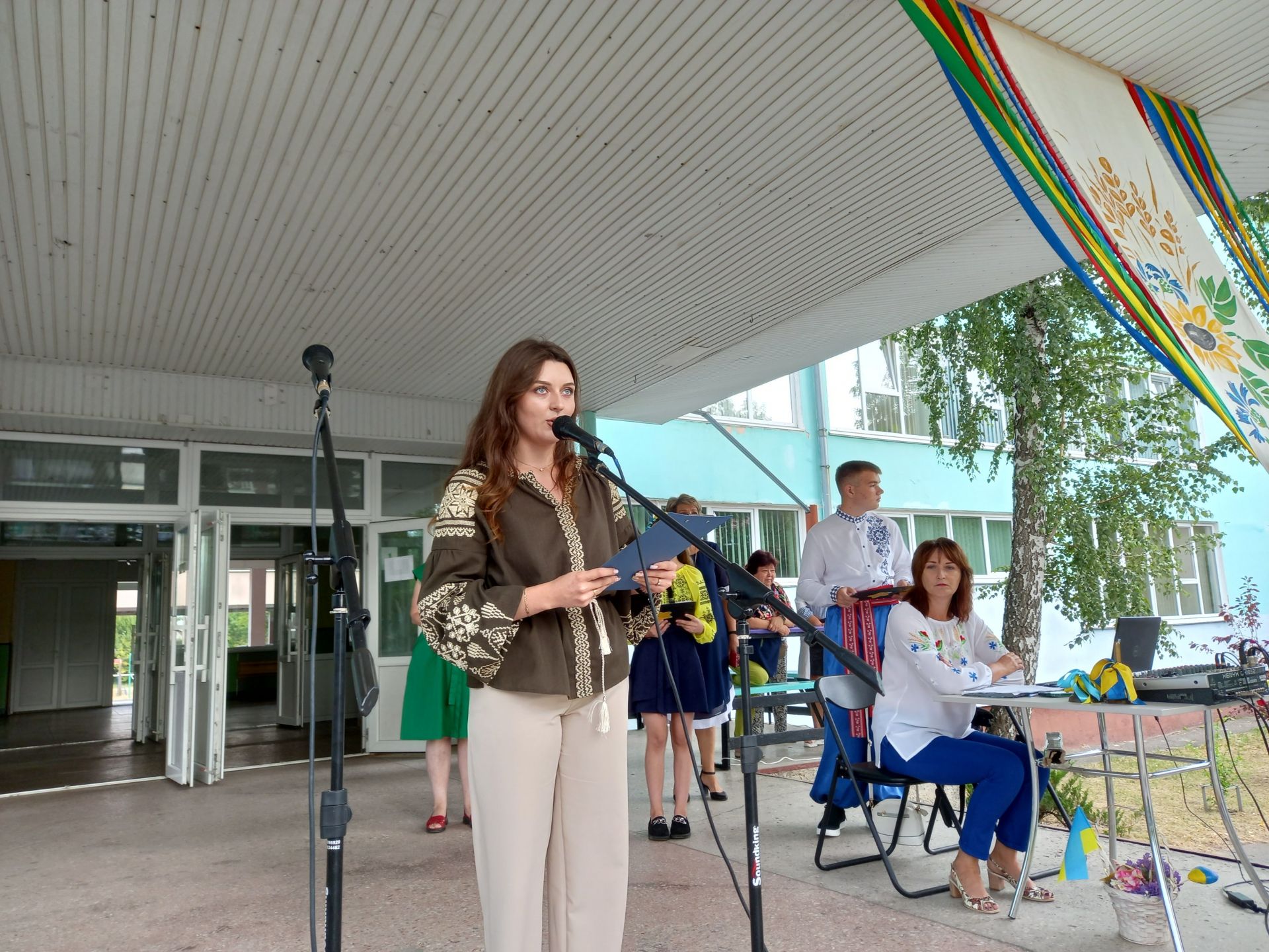 Директор побажала усім миру та міцного здоров’я. А тоді на імпровізованій сцені з’явилися Фея добрих справ та козак Залізняк. Вони мали особливу місію — привітати першокласників і передати їм чарівні зірки, які приносять добро та радість.