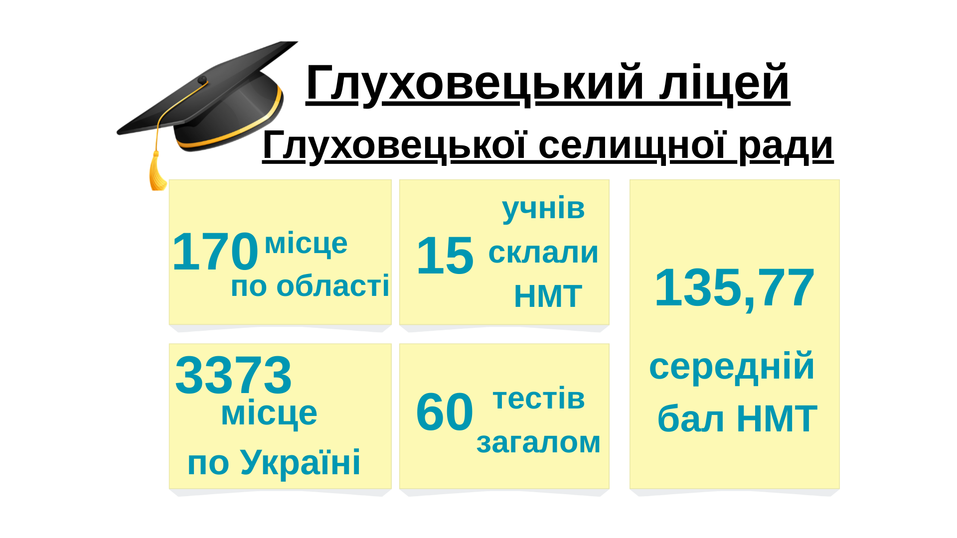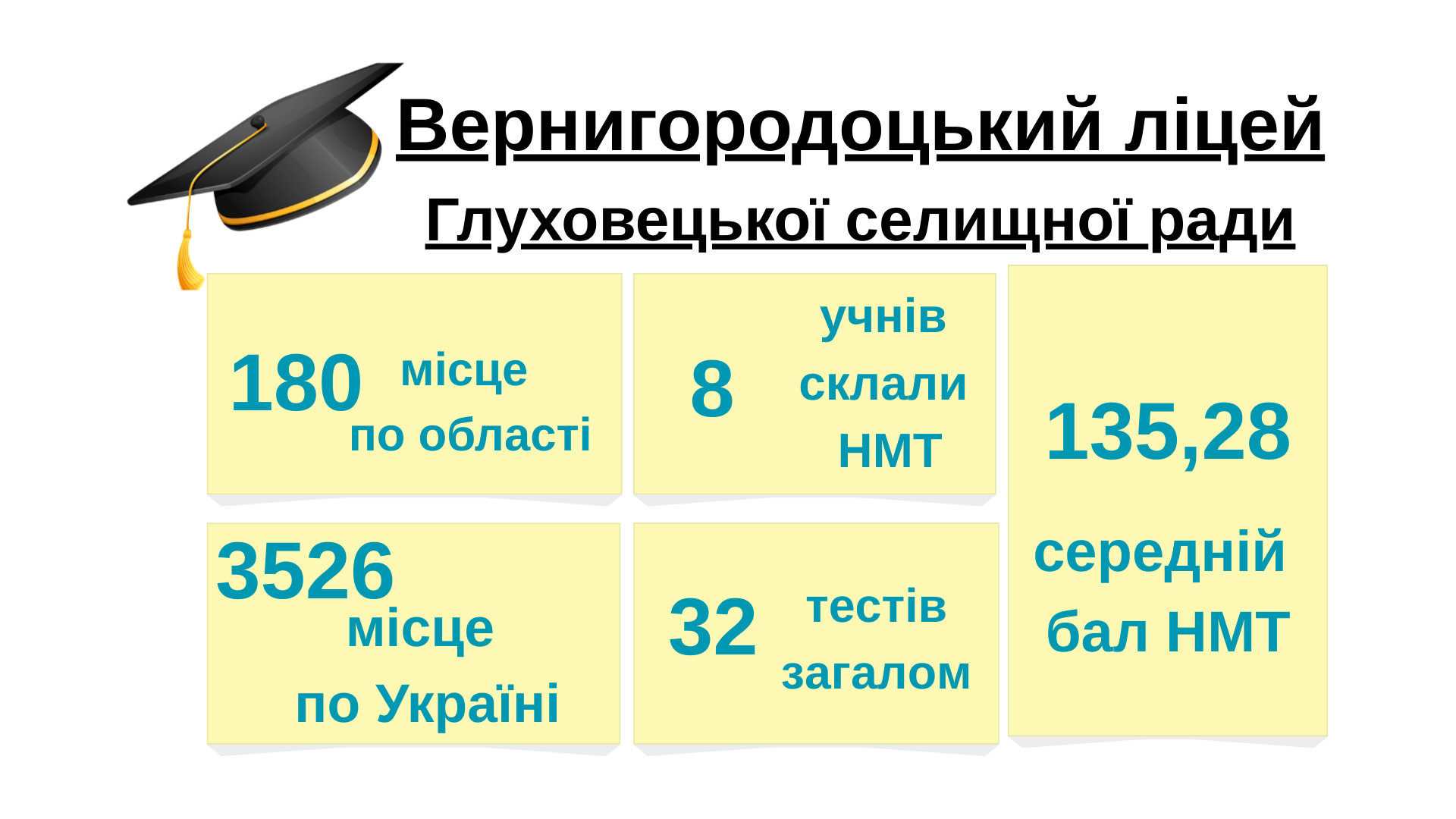 На десять позицій нижче перебуває Вернигородоцький ліцей Глуховецької селищної ради. Тут у розрізі предметів найкращий середній бал з української літератури. Додамо, що Вернигородоцький ліцей також значно покращив свої показники у порівнянні з минулим роком і піднявся в обласному рейтингу майже на сотню сходинок.