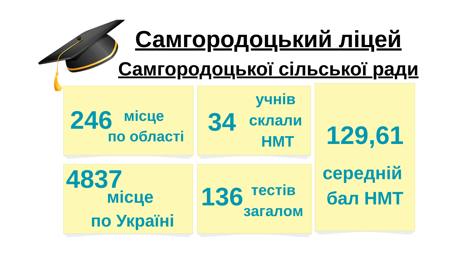 На п’ять сходинок нижче в обласному рейтингу — Самгородоцький ліцей Самгородоцької сільської ради, хоча загалом навчальний заклад покращив свої показники у порівнянні з минулим роком. У розрізі предметів тут найвищий середній бал з Географії. До речі, за результатами НМТ з цього предмету Самгородоцький ліцей наразі на 50 місці в області.