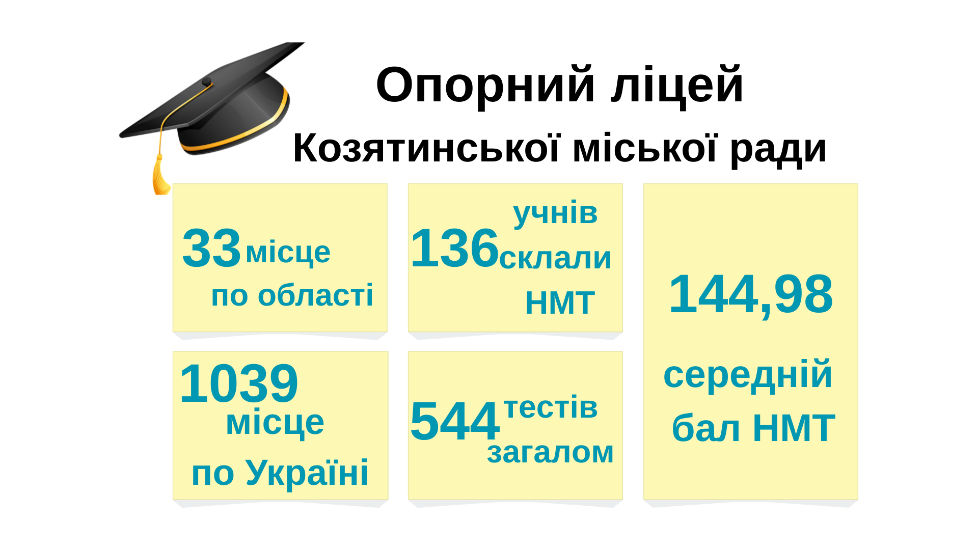 Попри те, що в опорному ліцеї Козятинської міської ради 200-бальників більше (цьогоріч максимальні бали за НМТ з математики одержали Гліб Оліярський та Максим Лагодюк), навчальний заклад за даними порталу «Education.ua» посів у обласному рейтингу 33 сходинку. Це значно кращі результати, ніж торік. У опорному ліцеї було шість випускних класів. Це рекордна кількість. У розрізі предметів найвищі середні бали з біології та української мови.