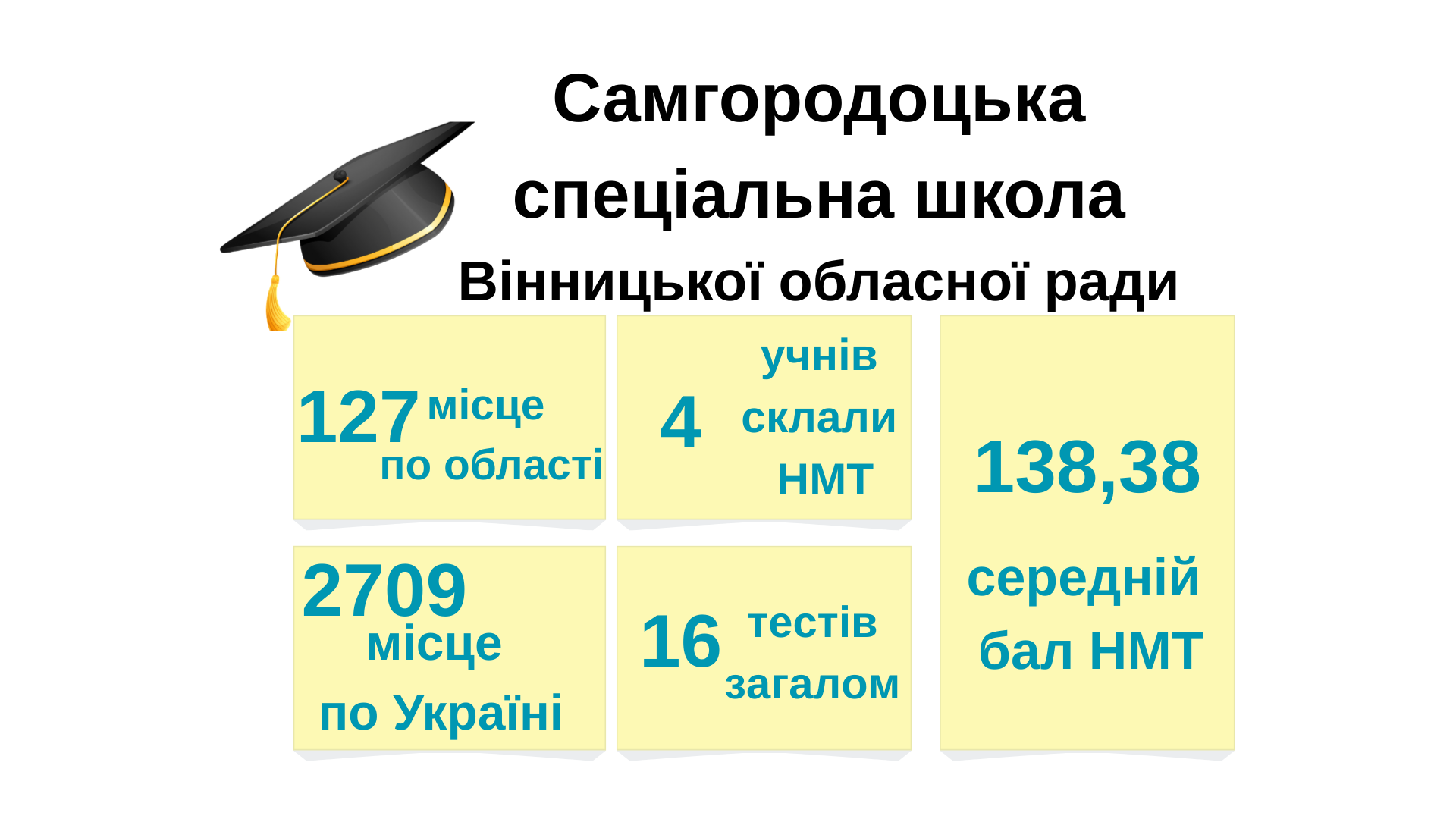 Самгородоцька спеціальна школа Вінницької обласної ради не увійшла до першої сотні в обласному рейтингу, але також покращила свої показники у порівнянні з минулим роком. У цьому навчальному закладі було найменше випускників, які складали НМТ, серед шкіл Козятинщини. У розрізі предметів у Самгородоцькій спеціальній школі найвищий середній бал за тестування з біології.