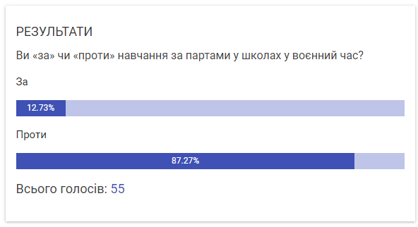 «Проти навчання у школах під час війни. Коли був вірус ,діти сиділи вдома ,а як ходили до школи, то в масках та з антисептиками. Зараз війна, може статись що завгодно, вже маска з антисептиком не спасе. Та навіть підвали стануть пасткою! Про яке очне навчання йде мова?»
