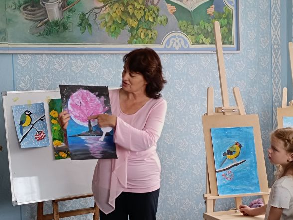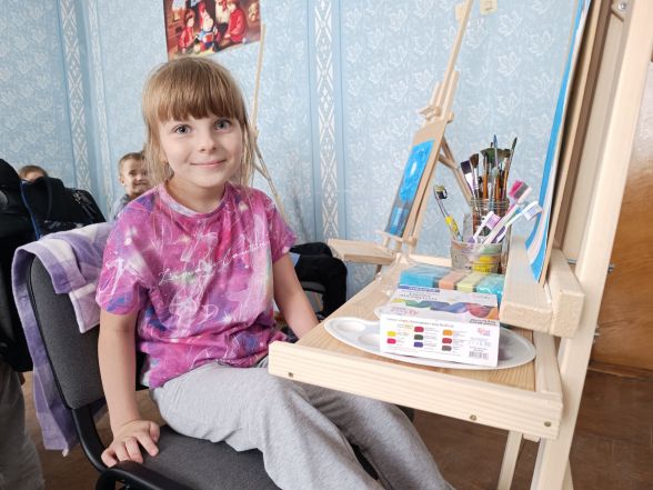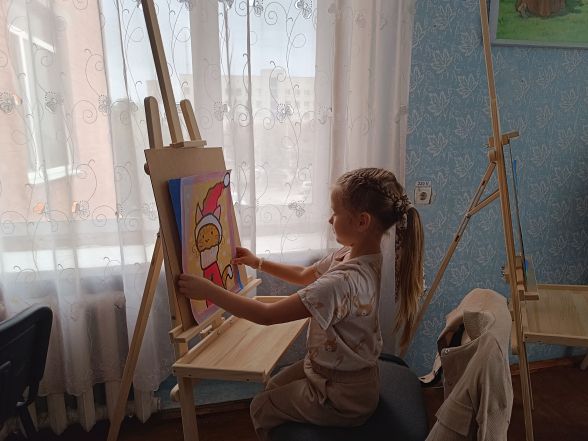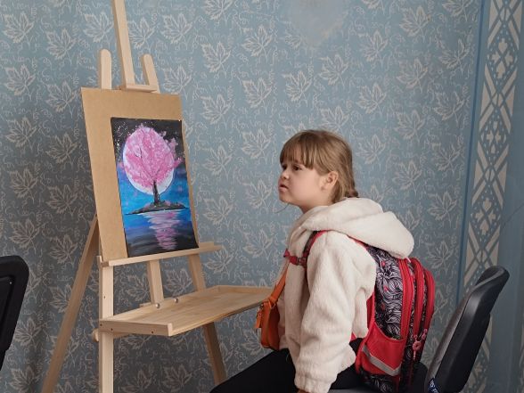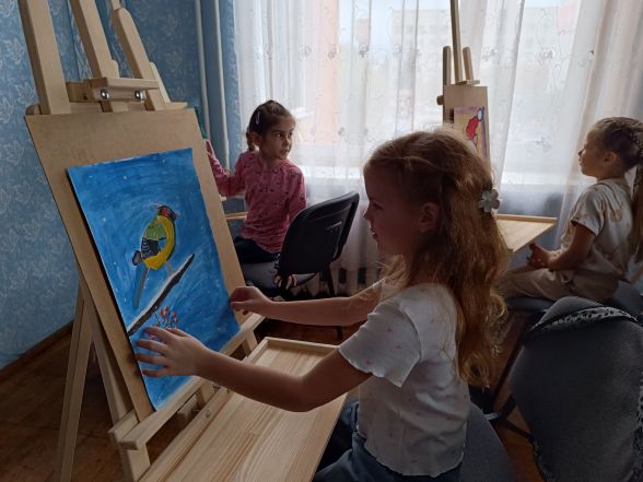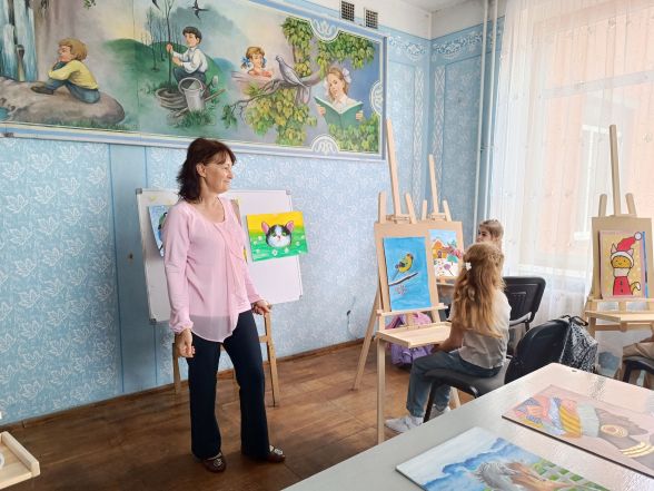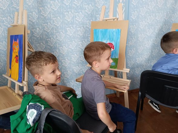 — Так, і називається це мольберт, — каже керівник гуртка. — За мольбертом працюють справжні художники.