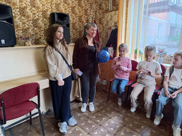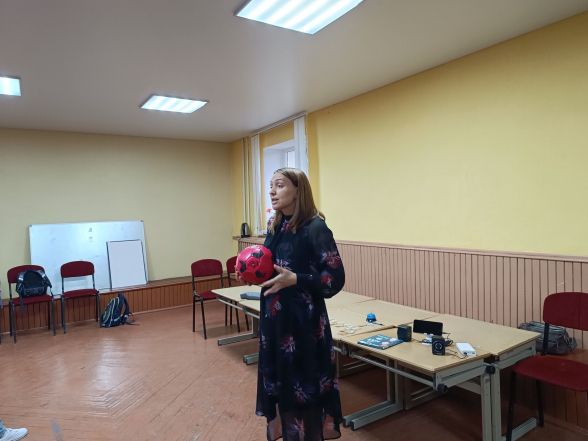 — Я хочу з вами познайомитися, бо багатьох не знаю. Пограємо в гру «Catch a ball» — лови м’яч, — пропонує Наталія Мудрак. — My name is Natalia Leonidivna (мене звуть Наталія Леонідівна — англ.). А зараз я когось виберу і ви скажете, як звати вас.