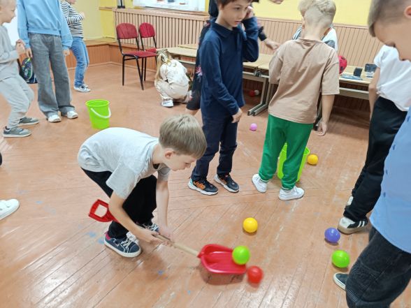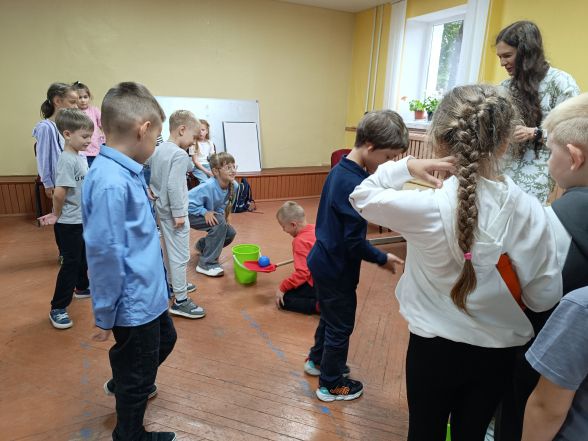 Діти знайомляться з керівником гуртка, а тоді Наталія пропонує пограти в ще одну цікаву гру. Спершу вона вголос рахує англійською, скільки дітей завітало до неї в кабінет. Хлопчики з дівчатками допомагають рахувати. А тоді показує різнокольорові м’ячики. Діти називають кольори англійською. Тепер час гри: хлопчики з дівчатками діляться на дві команди і отримують відерце та лопату. Завдання кожного — зачерпнути лопатою кольорову кульку, кинути до відеречка і передати наступному гравцеві. Діти з захопленням грають у веселу гру під музику, після чого отримують ще один ключ.