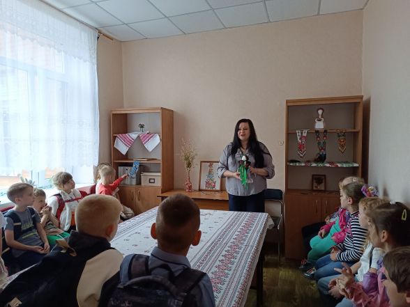 Діти роздивляються сувеніри, картини та іграшки, які виготовили вихованці гуртка, отримують другий ключ і прямують до кабінету гуртка «Берегиня», де навчають різних видів традиційної народної творчості.