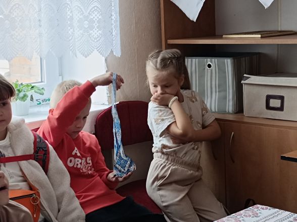 — Своє коріння потрібно зберігати. Це те, чим займалися ваші прапрабабусі, коли створювали мотанки для своїх діток. Вони робили прикраси з бісеру, плели із соломи, робили вироби з глини. Ця фігурка саме з глини, — показує керівник гуртка Наталія Баштова глиняну мотанку, яка тримає в руках буханець хліба. — На наших уроках ви навчитеся ліпити цікавинки з глини. Пригадайте, на Великдень усі що роблять?