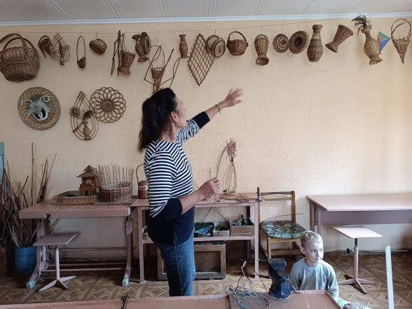 — Лоза чарівна, тому що з неї можна виготовляти чарівні речі. Все, що в цьому кабінеті, виготовлено з лози. Під час першого заняття ви можете виплести ось таке денце, — показує керівник гуртка Тетяна Фабіцька-старша. — Воно схоже на квіточку. Із денця починається будь-яка робота. На що б ми не подивилися, скрізь є денце, або кругле, або овальне. Ви зможете вже в перший день його виплести, забрати додому і подарувати мамі чи бабусі. Це може бути чудова підставка під чашку чи каструлю.