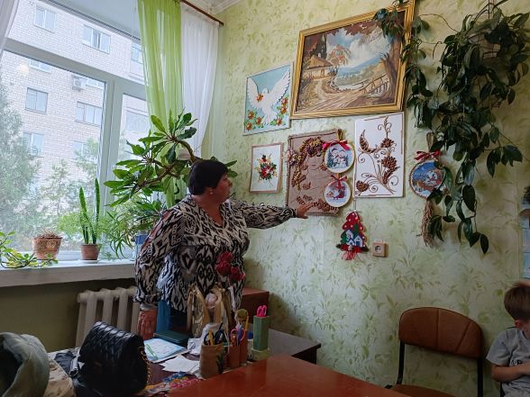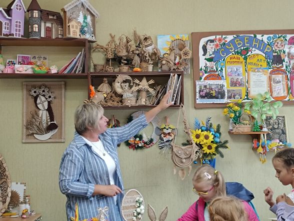 Тетяна Фабіцька-старша показує дітям речі, які виготовляють вихованці її гуртка: серветниці, кошики, підставки і навіть стільчики. Діти отримують ще один ключ.