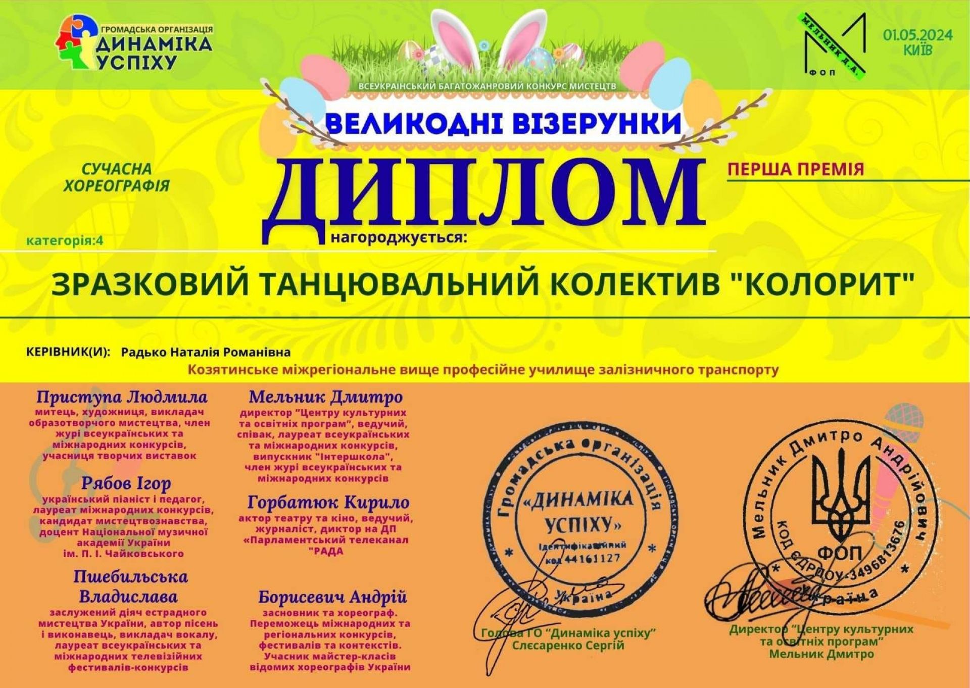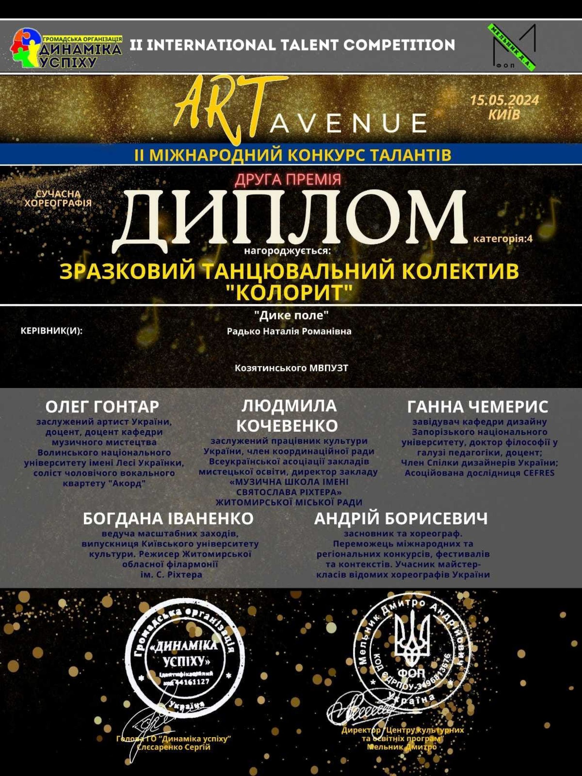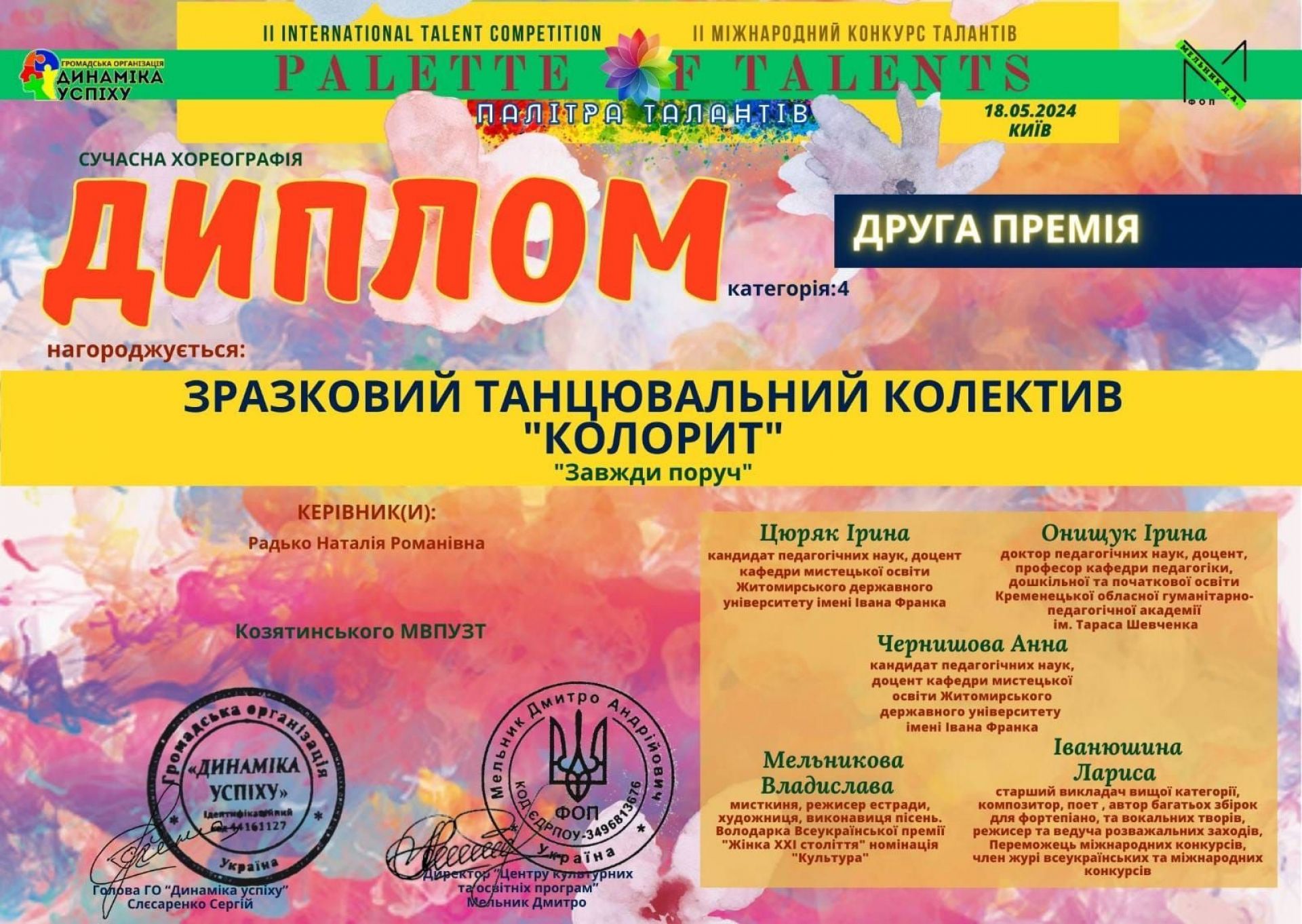Зразковий танцювальний колектив "Колорит" здобув такі нагороди: