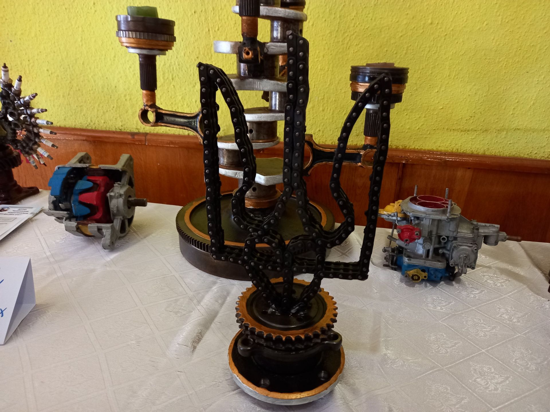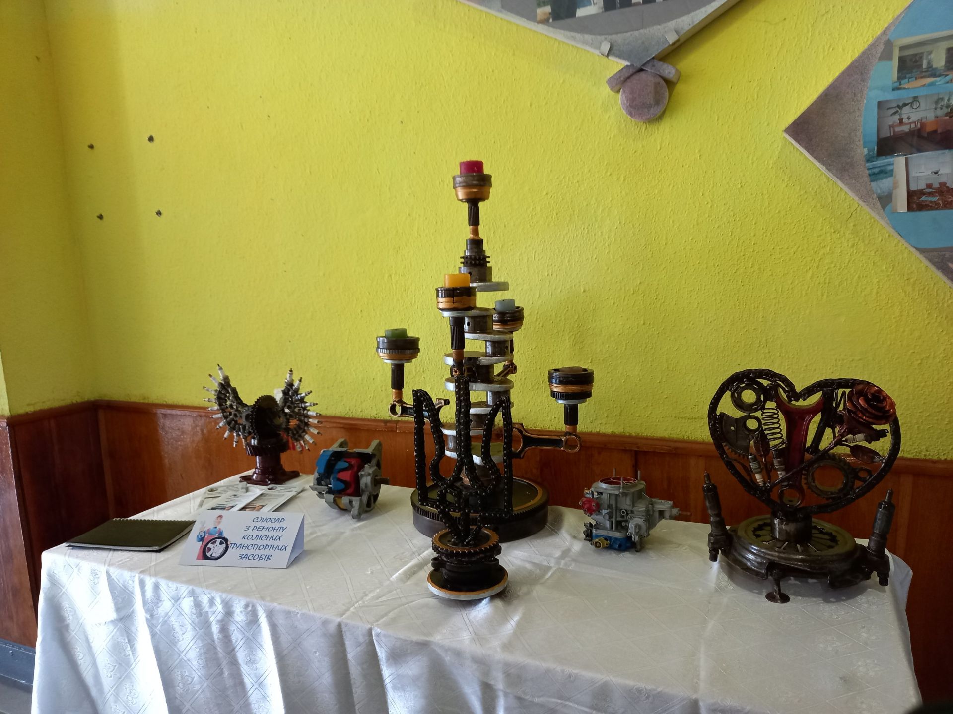 По інший бік стіл із міні-скульптурами. Серце з квіткою, підсвічник, Тризуб, птаха — усе це майстер виробничого навчання слюсарів з ремонту колісних транспортних засобів Андрій Огірчук робить разом зі своїми учнями з автомобільних запчастин. Натхнення для дизайну черпають з інтернету.