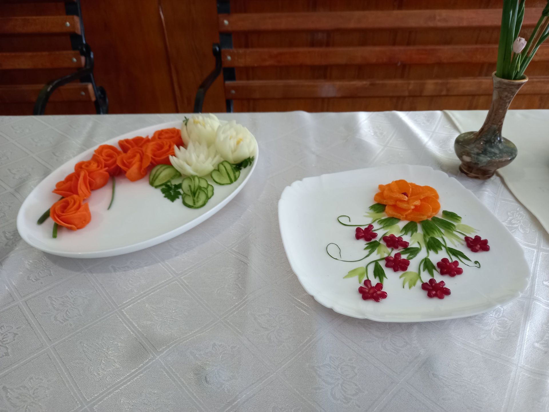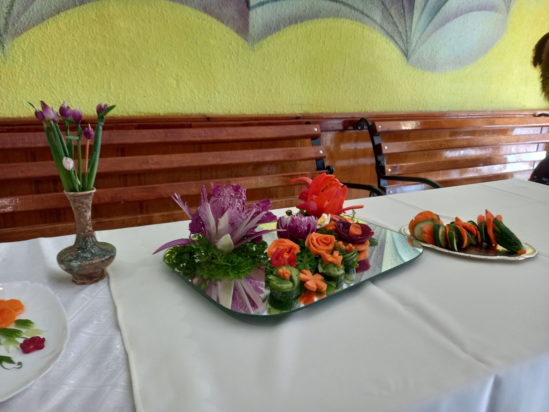 У коридорі перед актовою залою облаштували міні-виставки кожної з професій, якої навчають в училищі. На одному зі столів — шедеври від майбутніх кухарів-офіціантів-кондитерів. Дівчата з хлопцями підготували не лише торти та тістечка, а й квіти з овочів.