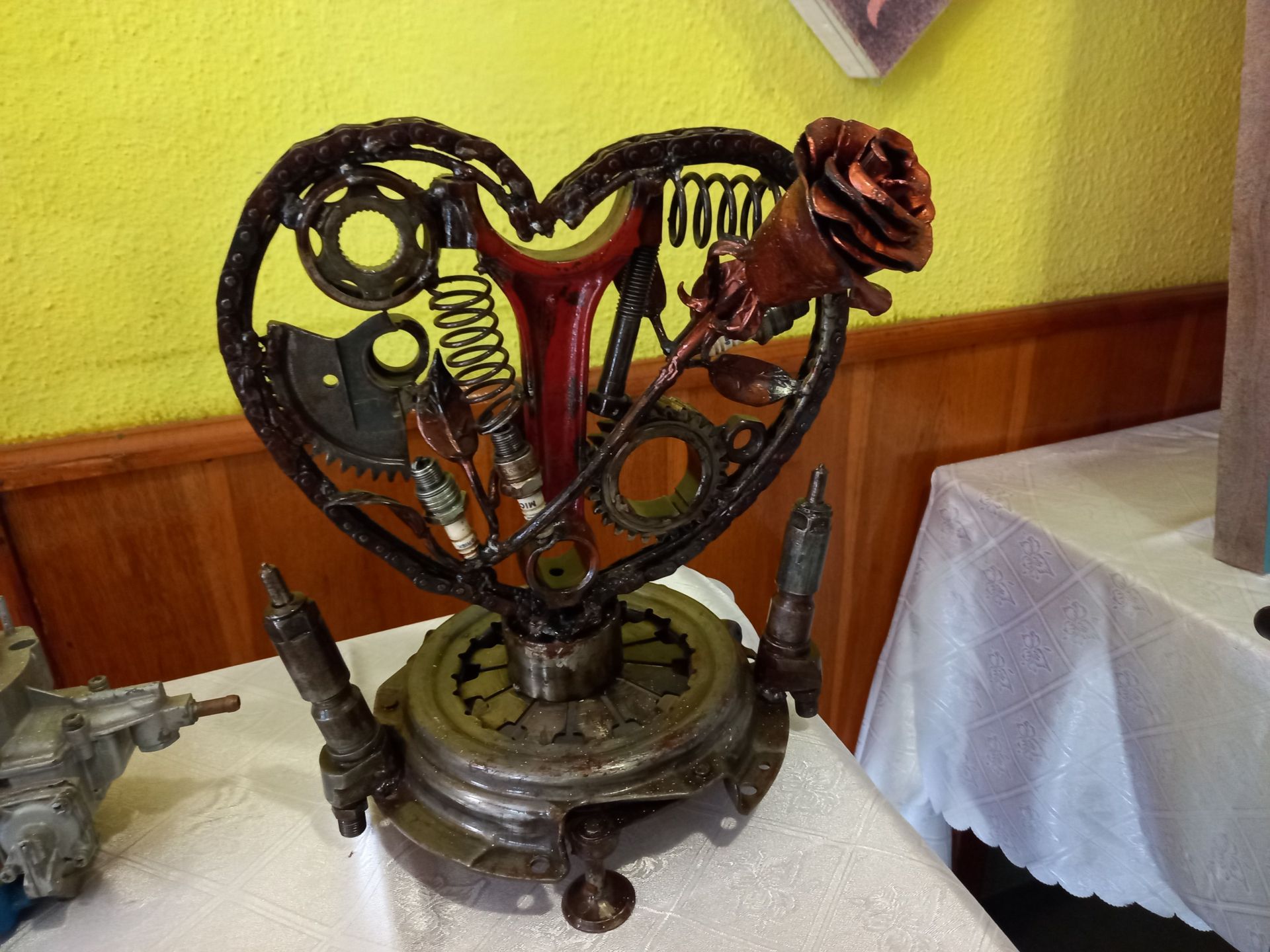 — Тут у нас колінчастий вал двигуна, плюс махові ШРУСи, — показує Андрій Огірчук гігантський підсвічник. — У слюсарній термінології це називається граната на приводі. Ми ці деталі приварили і вийшов підсвічник. Тут, де птах, у нас свічки запалювання, ланцюги, шестерня без перевалу, шестерня з коробки передач і маточинка. Так само це серце зроблене з ланцюга, ще у нас тут корзина щеплення, форсунки, клапани і менші елементи — свічки, шатун. Троянда — це єдиний декор не з автомобільної серії.