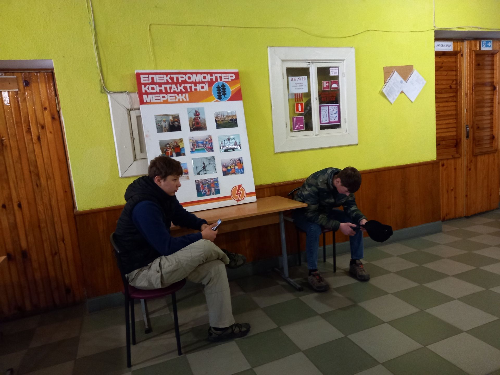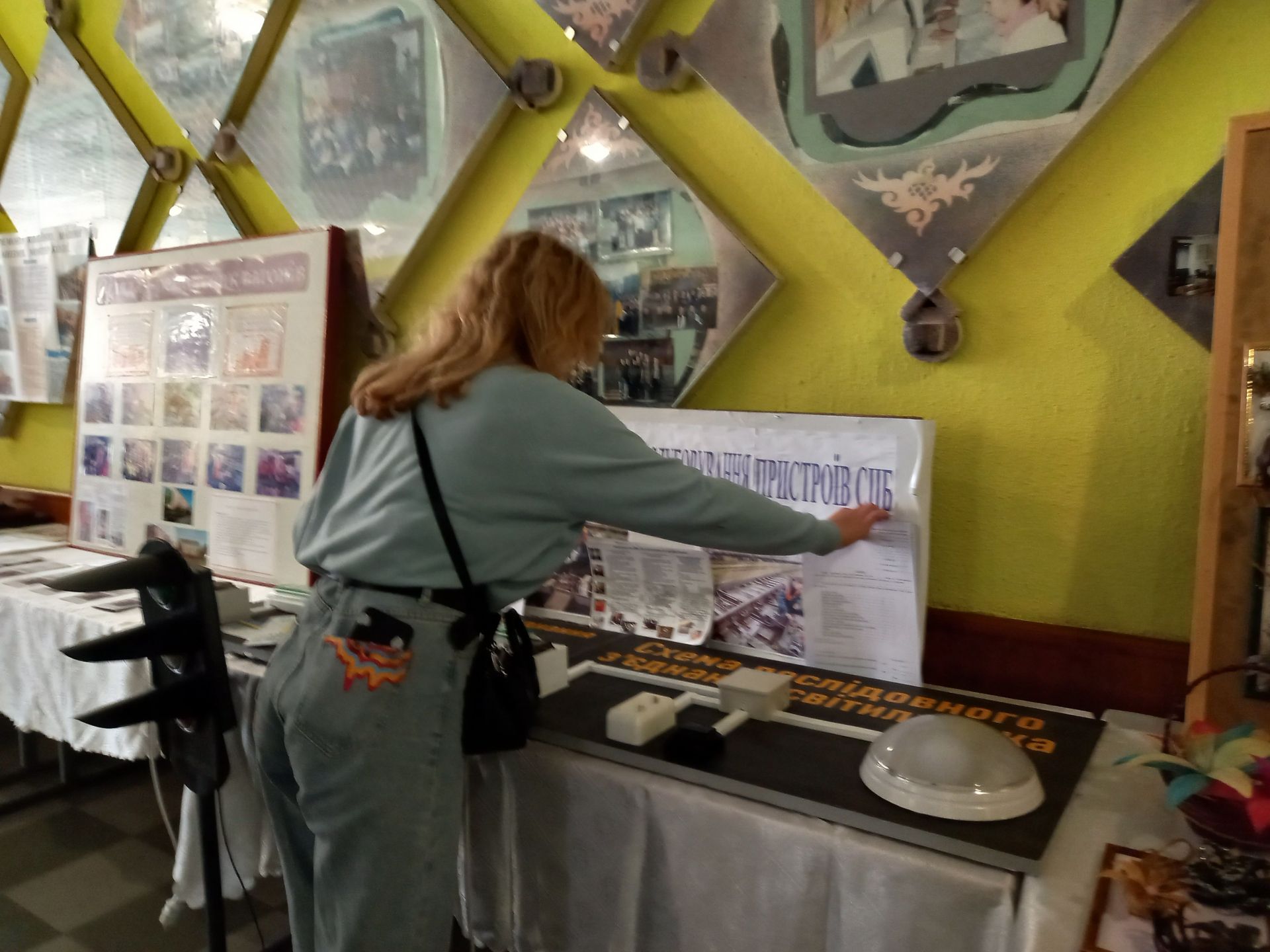Поруч стіл, де першокурсники Ельзара та Костя презентують професію «Електромонтер з ремонту та обслуговування пристроїв СЦБ (сигналізації, централізації, блокування)». Біля них — макет світлофора і дві схеми послідовного увімкнення і вимкнення пристроїв.