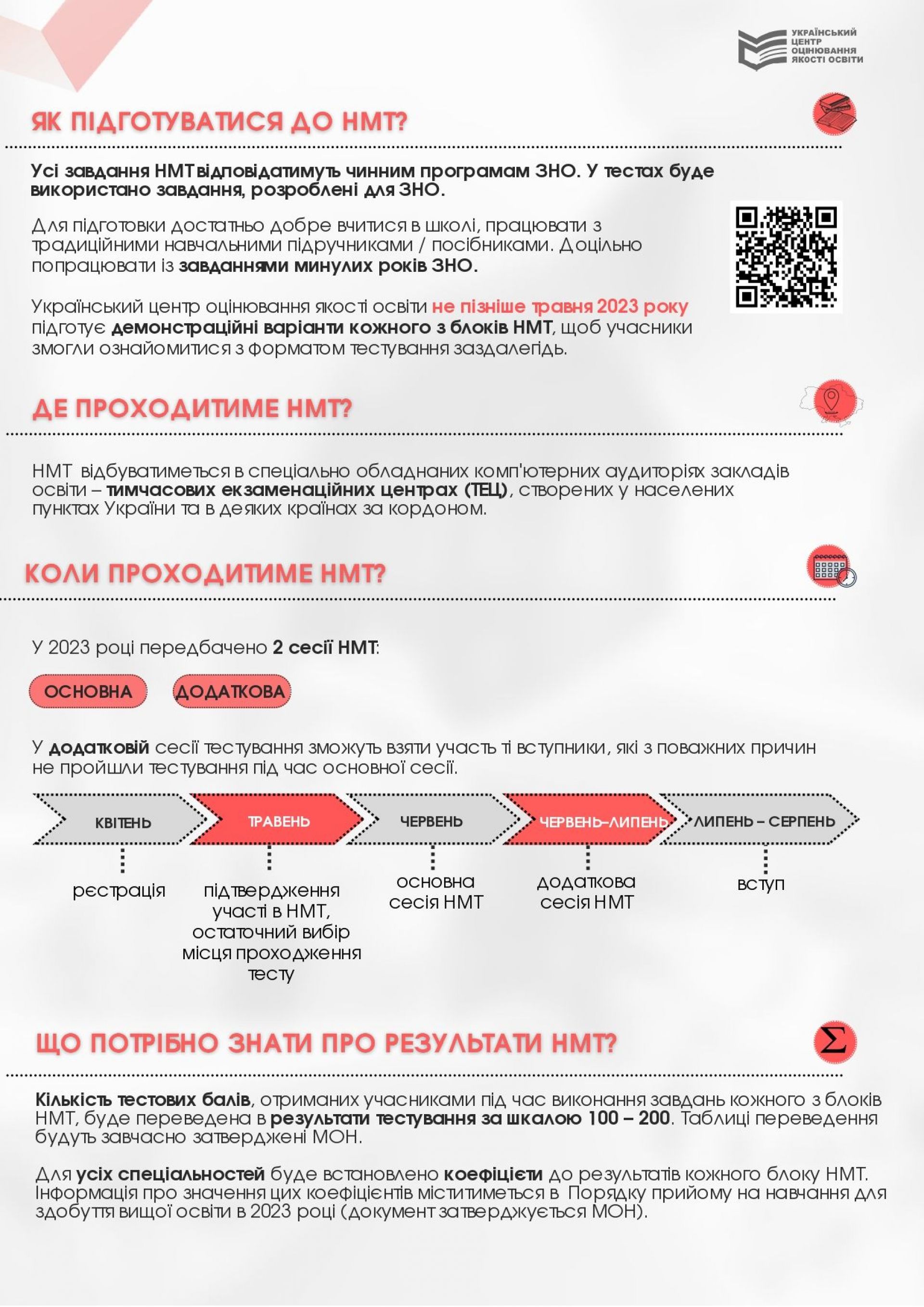 «НМТ буде складатися вступником протягом одного дня у форматі комп'ютерного тестування загальною тривалістю 180 хвилин. Складання НМТ в один день зменшує безпекові ризики учасників тестування, робить більш безпечною та простою організацію проведення НМТ, дозволяє уникнути зайвих логістичних витрат державі та родинам учасників випробувань», — підкреслив Сергій Шкарлет.