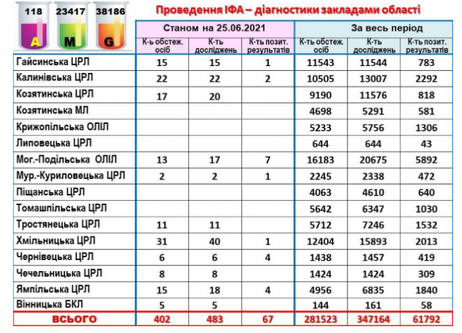 За данми козятинського відділу лабораторних досліджень на Козятинщині станом на ранок 25 червня загальна кількість інфікованих на коронавірус козятинчан сягає 3011 осіб