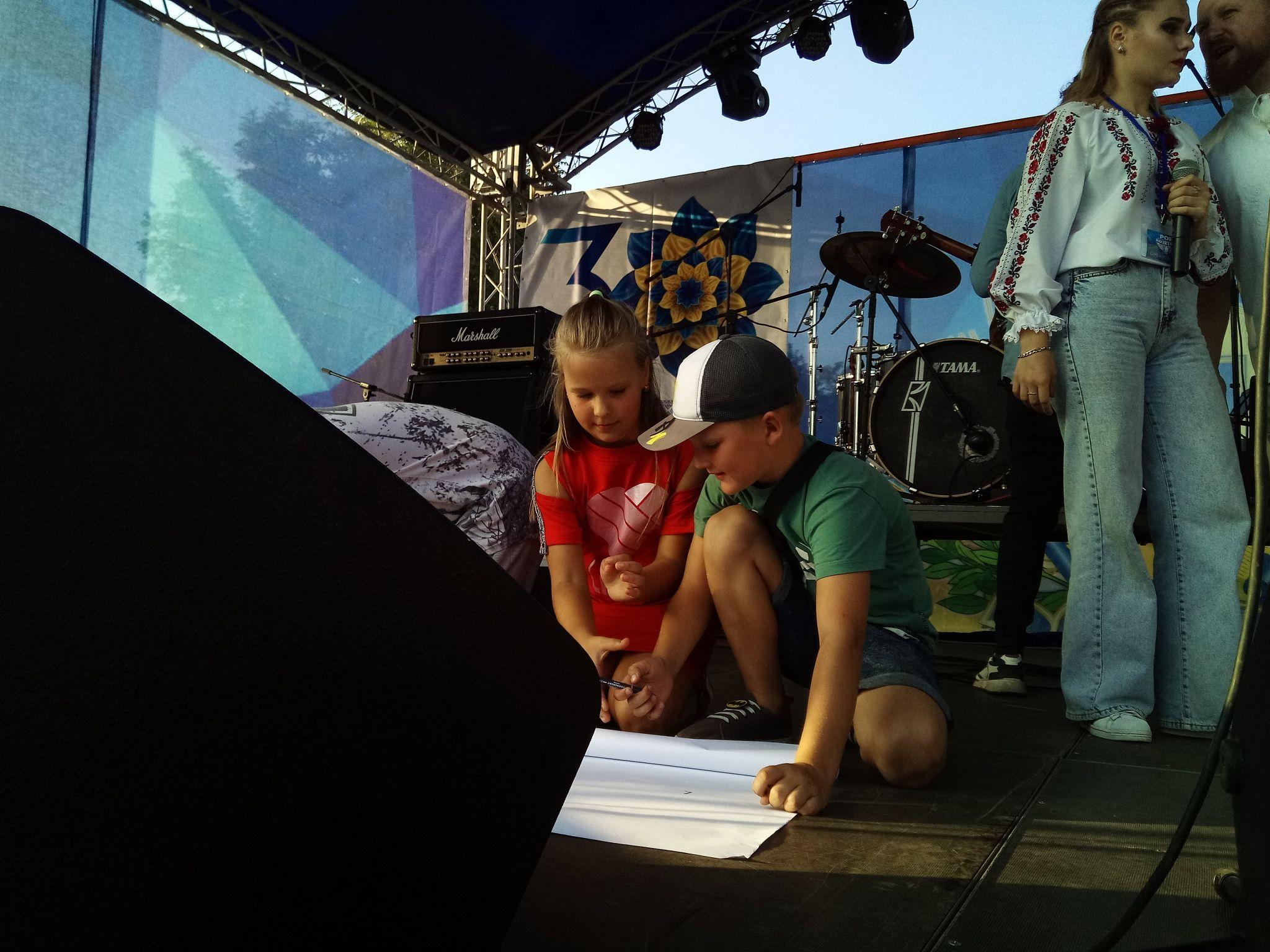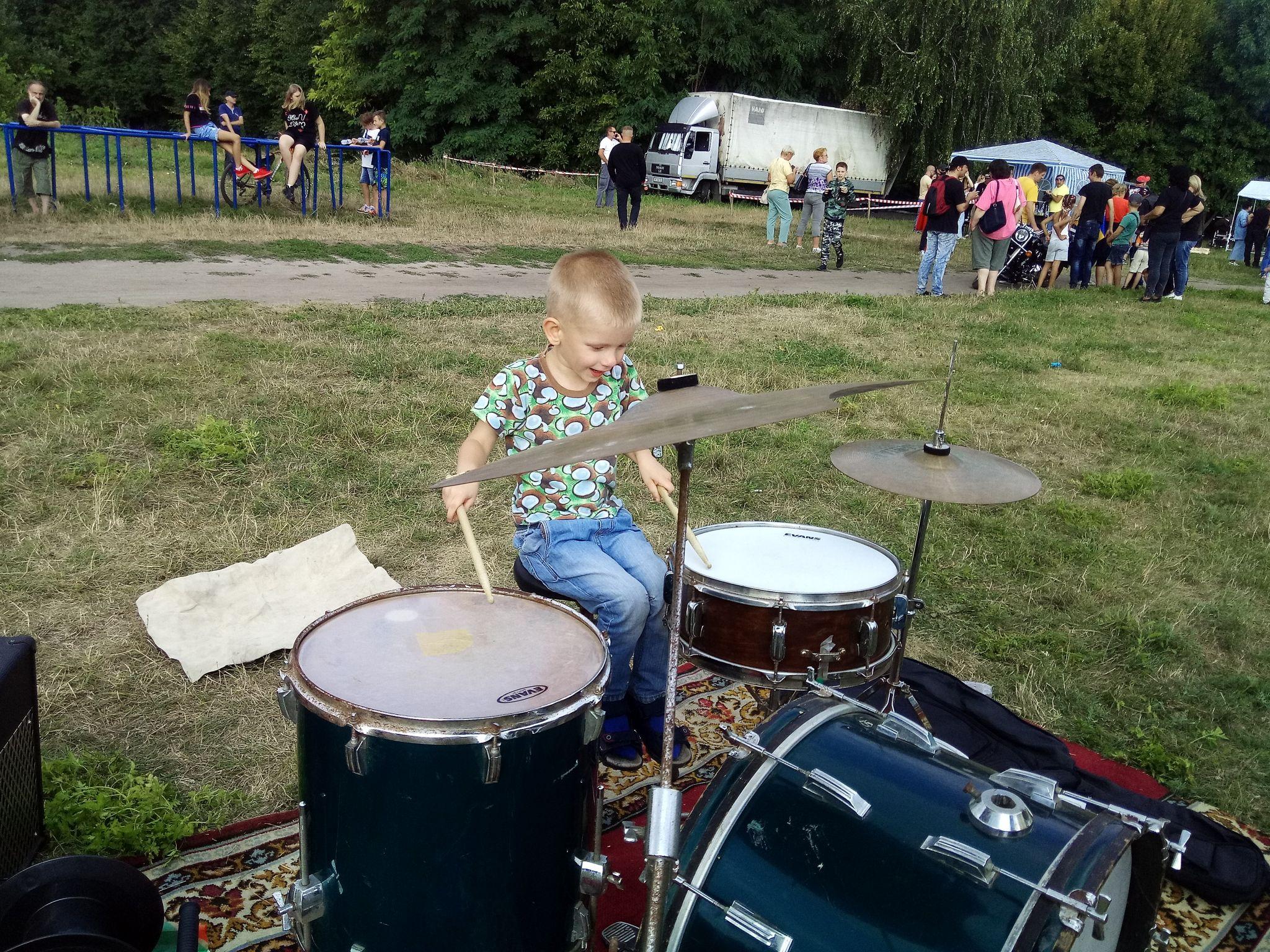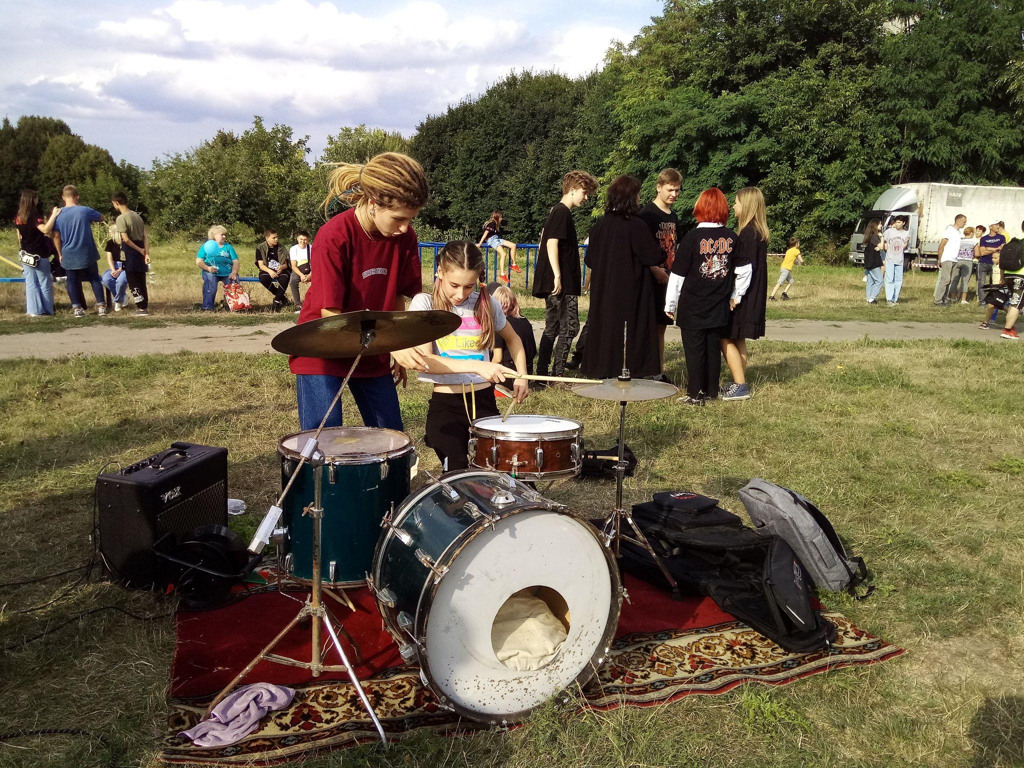 Праворуч від сцени розгорнули локацію, де музиканти до початку заходу проводили майстер-клас із гри на музичних інструментах. Багато дітей підходили просто подивитись, хто сміливіший, сідав за барабанну установку і пробував грати сам.