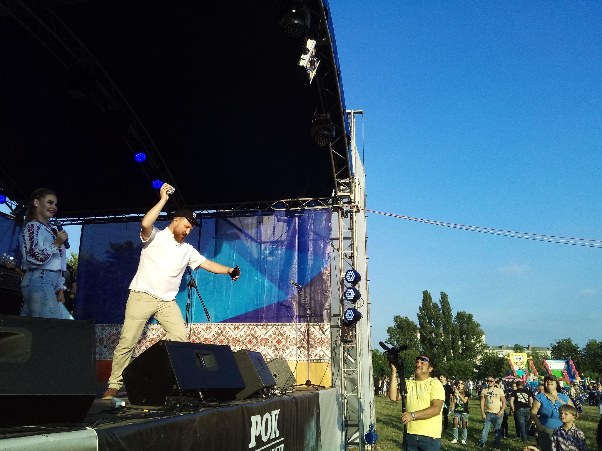 Після цього пішли конкурси. Артур Корніюк жбурляв зі сцени у натовп кепку і шкарпетки з логотипом одного зі спонсорів фестивалю. Ведучий пожартував, що кидає їх, як наречена букет.