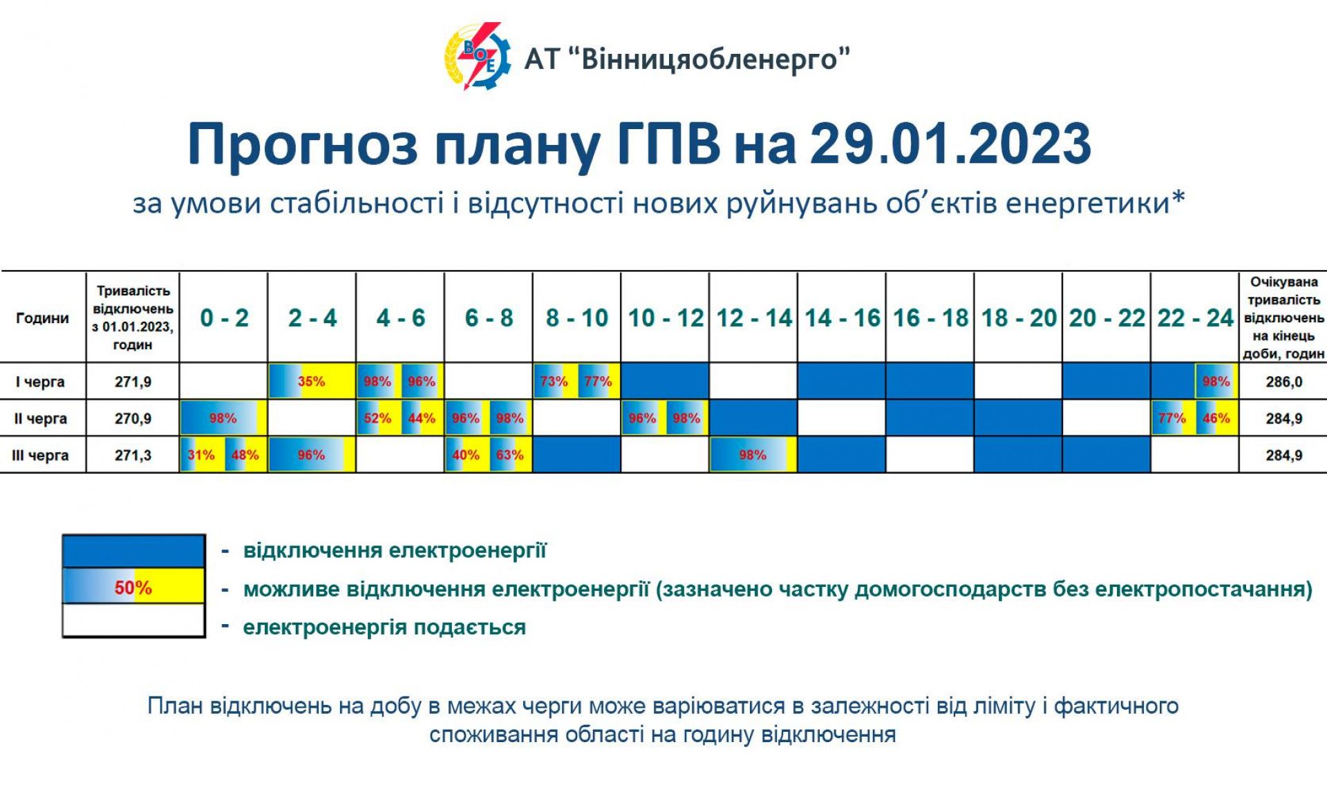 - У «Вінницяобленерго» опублікували графік погодинного знеструмлення, який діятиме протягом 29 січня.