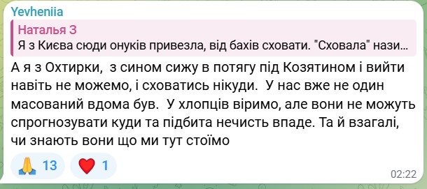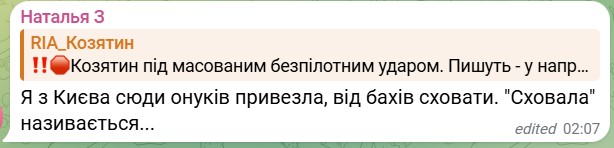Ракети на Київ і знову… Козятин! В грудях просто пече. Кілька хвилин і твої молитви почуті. Сьогодні пронесло. Чекаємо тепловоза.» — написала Наталя.