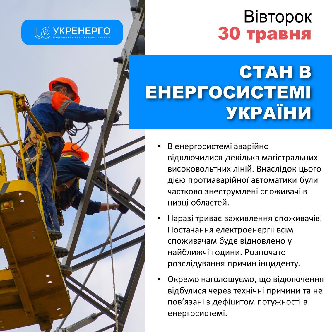 Повідомляють — близько 13.00 в енергосистемі аварійно відключилися декілька магістральних високовольтних ліній. Внаслідок цього дією протиаварійної автоматики були частково знеструмлені споживачі в низці областей.