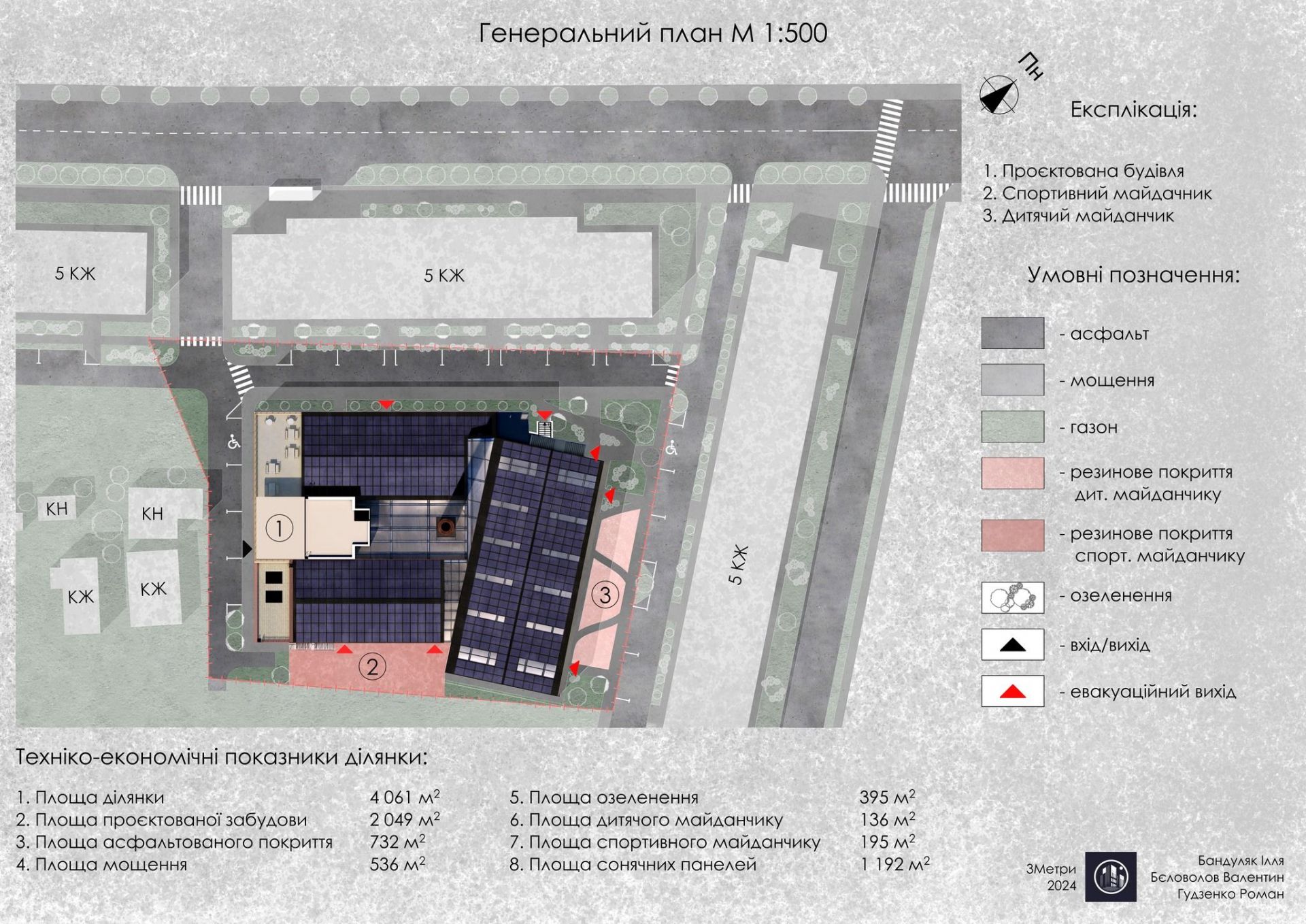 «Існуюча будівля котельні не використовується за призначенням. Споруда у занедбаному стані, але опорні конструкції зберігають свою функцію. Для розширення функціоналу майбутнього спортивного комплексу було прийнято рішення добудовувати нові корпуси, включно з підземним поверхом для використання останнього як укриття. Котельня розташована у дворі житлової багатоквартирної забудови, через що виникають складні умови для подальшого проєктування. Для місцевих мешканців, які в подальшому стануть користувачами комплексу, був організований громадський простір із дитячим майданчиком, а також облаштовані паркінги.