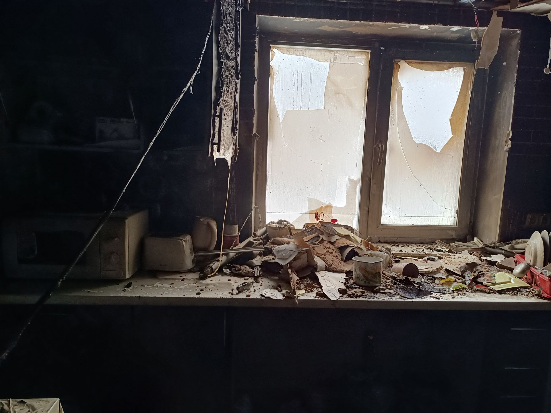 Усі кімнати задимлені. Вогонь пошкодив не тільки меблі, побутову техніку та газові прилади, а й дах — у деяких місцях на стелі в кухні видніються дірки.