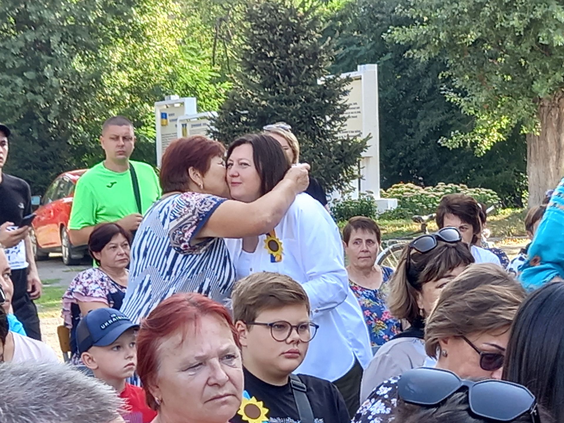 — Коли гортаєш Фейсбук і дивишся новини, перед очима світлини наших воїнів, які повертаються на щиті, — сказала Ірина Москалюк. — Ми сьогодні в першу чергу маємо бути вдячними їм за той спокій, що ми сьогодні живемо в цій країні, що першого вересня ви, діти, нарешті підете в школу і можете спілкуватися. Цей спокій відносний. Але тільки завдяки тим, хто загинув, тим, хто сьогодні лікується, завдяки нашим Збройним силам Україна переможе. Хоча інколи чуєш «Ай, моя хата скраю». Але я вам скажу закінчення цього козацького прислів’я: «Моя хата скраю, першим ворога зустрічаю». Зустріли ми його, даємо здачі і перемога буде за нами.