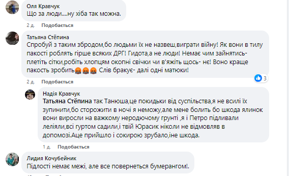— Біль, образа, гнів переповнюють мене. Знову на зоні відпочинку «Талимонівка» зрубали ялинку. Діяли на випередження. Звертаюся до браконьєрів зелених насажджень — ви нелюди, вам це так не пройде, природа не прощає знущань, а Бог все бачить, — написала козятинчанка Надія Кравчук