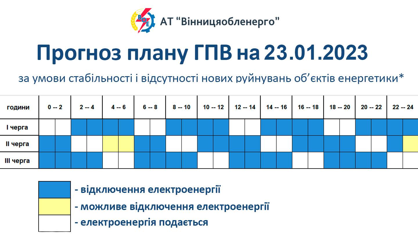 Відповідно до доведеної граничної величини споживання електричної потужності на 23.01.23 р. по Вінницькій області задіяли обмеження електроспоживання відповідно до графіка погодинного відключення ГПВ
