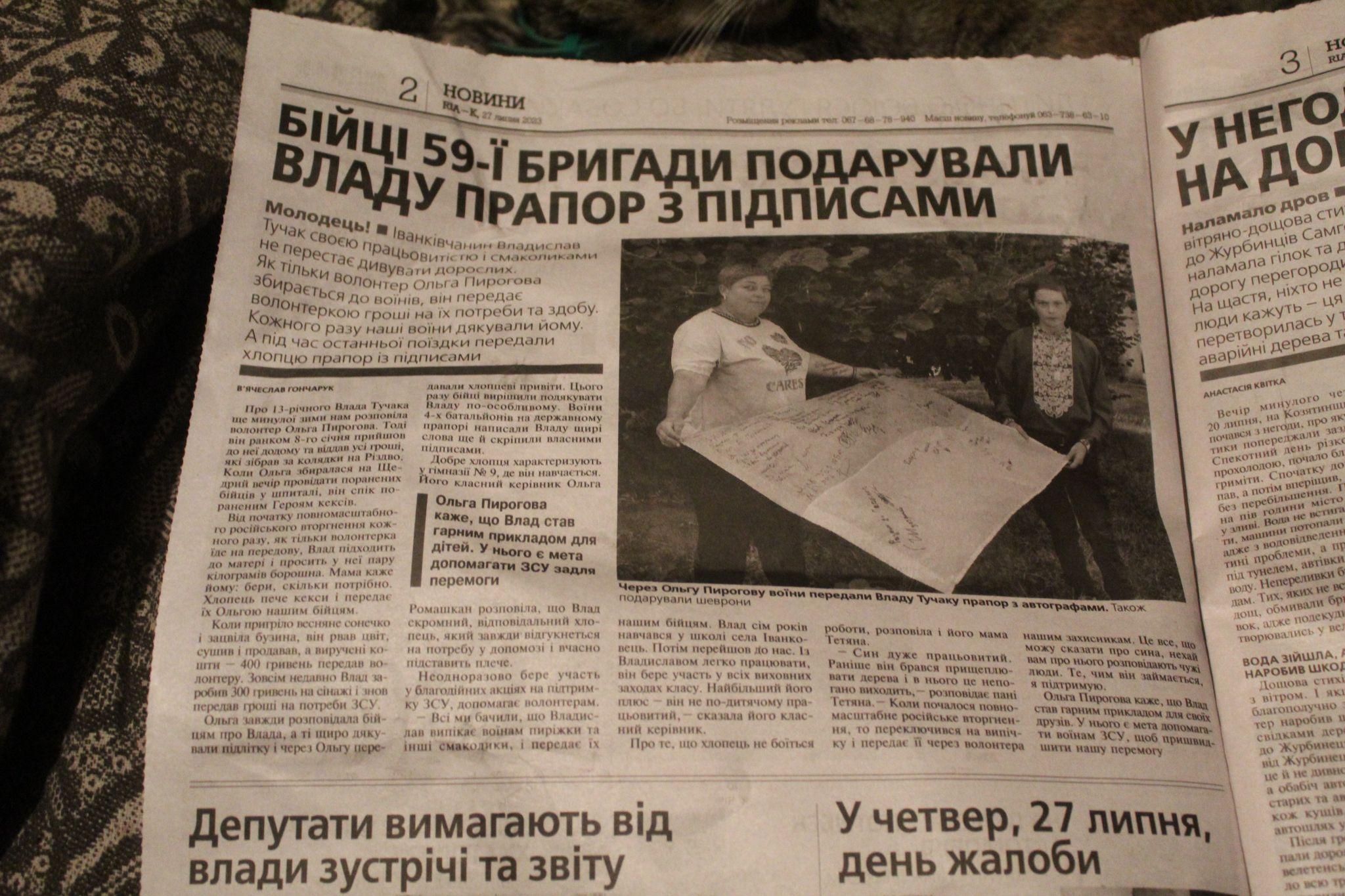 Про 13-річного Влада Тучака ще минулої зими нам розповіла волонтер Ольга Пирогова. Тоді він ранком 8-го січня прийшов до неї додому та віддав усі гроші, які зібрав за колядки на Різдво. Коли Ольга збиралася на Щедрий вечір провідати поранених бійців у шпиталі, він спік пораненим Героям кексів.