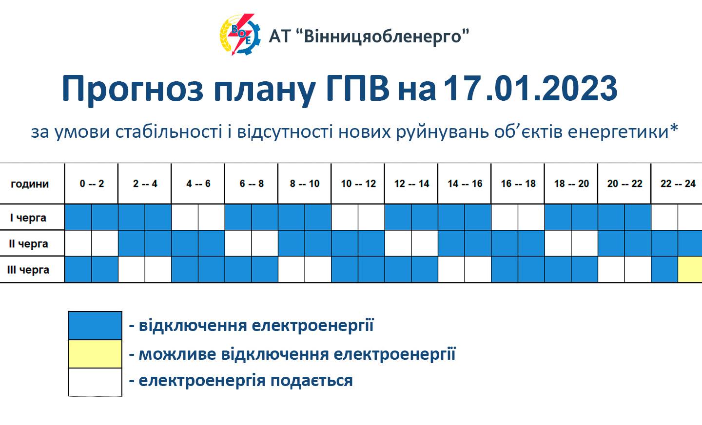 — Відповідно до доведеної граничної величини споживання електричної потужності на 17.01.23 р. по Вінницькій області задіяли обмеження електроспоживання відповідно до графіка погодинного відключення ГПВ, — повідомляє Вінницяобленерго