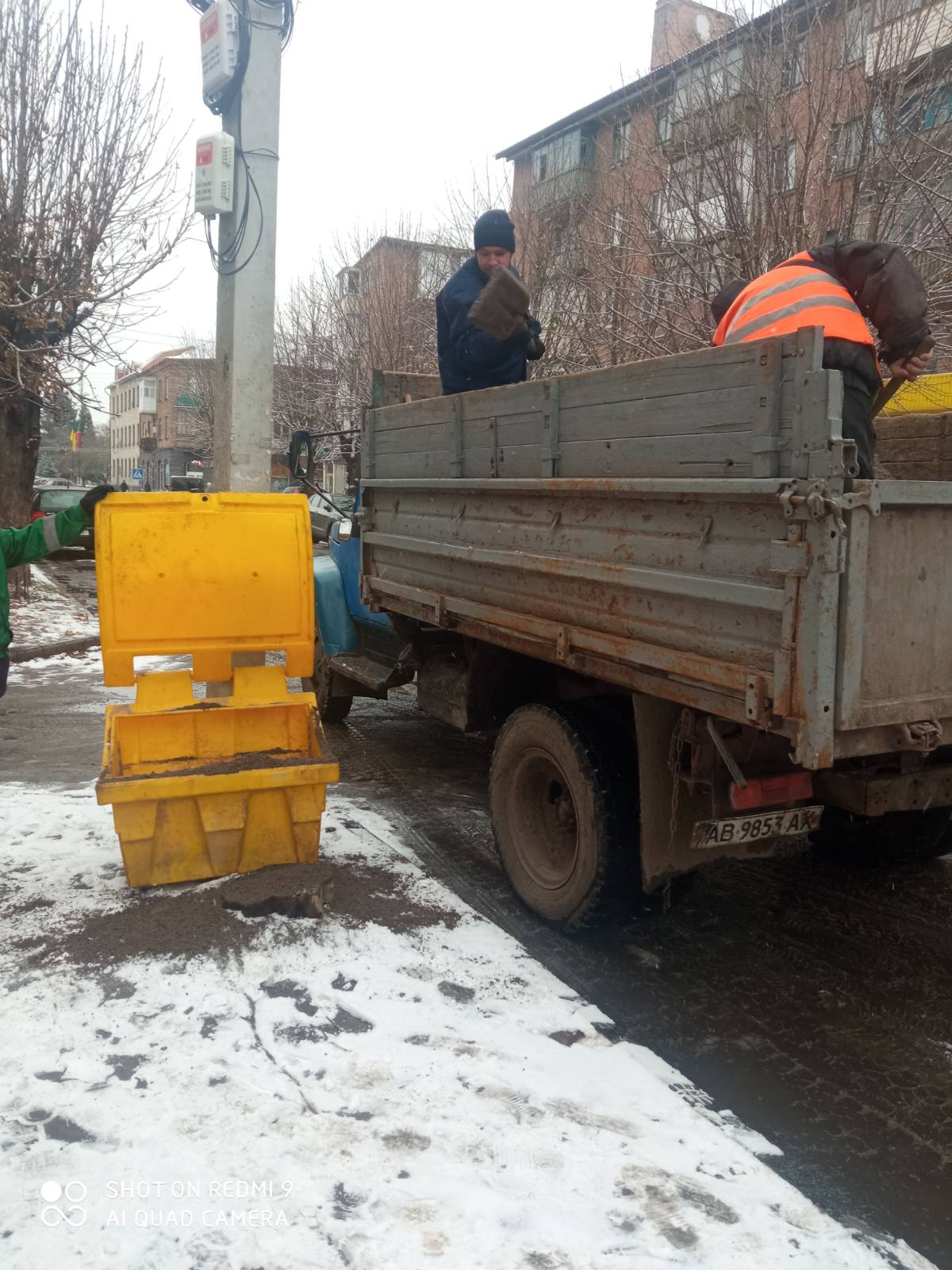 До прикладу, у сусідній Калинівській громаді, ще на тому тижні працівники комунального підприємства подбали про наявність посипного матеріалу у ящиках, які облаштовані на території міста, та встановили нові ящики у додаткових місцях.