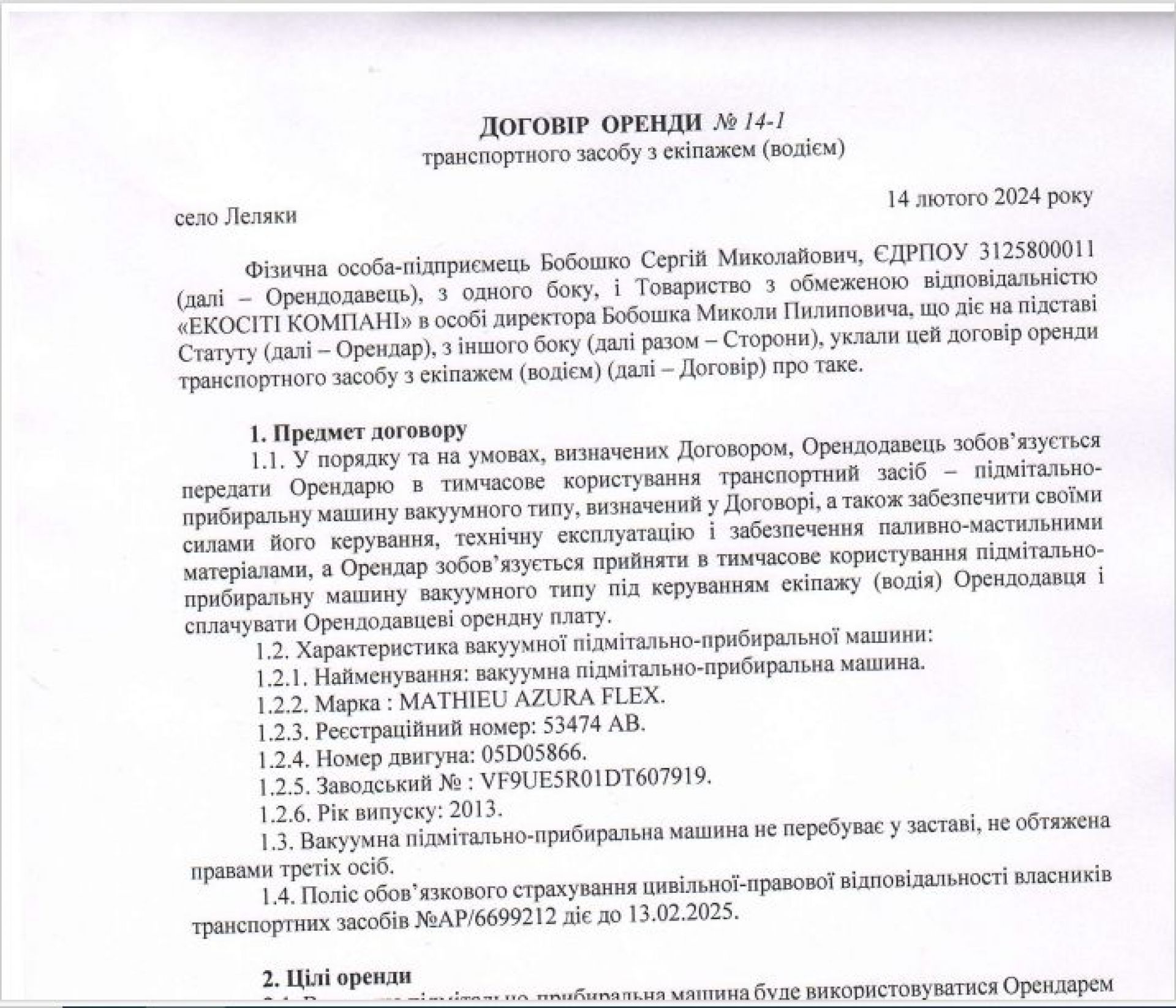 Відповідно до документації, ця фірма вакуумну підмітально-прибиральну машину теж орендує, але не в козятинського «Чистого міста», а в підприємця, який за даними аналітичної системи YouControl, зареєстрований у селі Леляки. Тому Жмеринку і Браїлів буде прибирати зовсім інша машина — MATHIEU AZURA FLEX 2013 року випуску. Адже саме цей транспортний засіб, згідно із договором оренди, буде використовувати «Екосіті Компані».