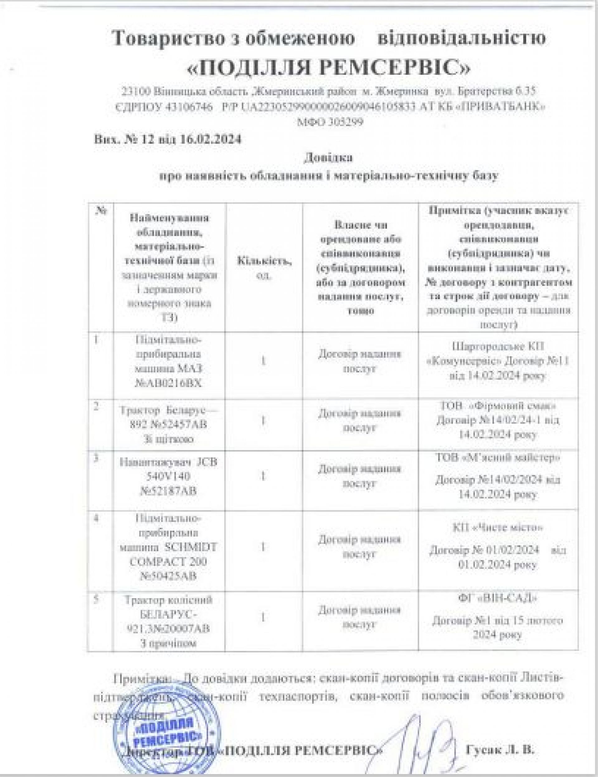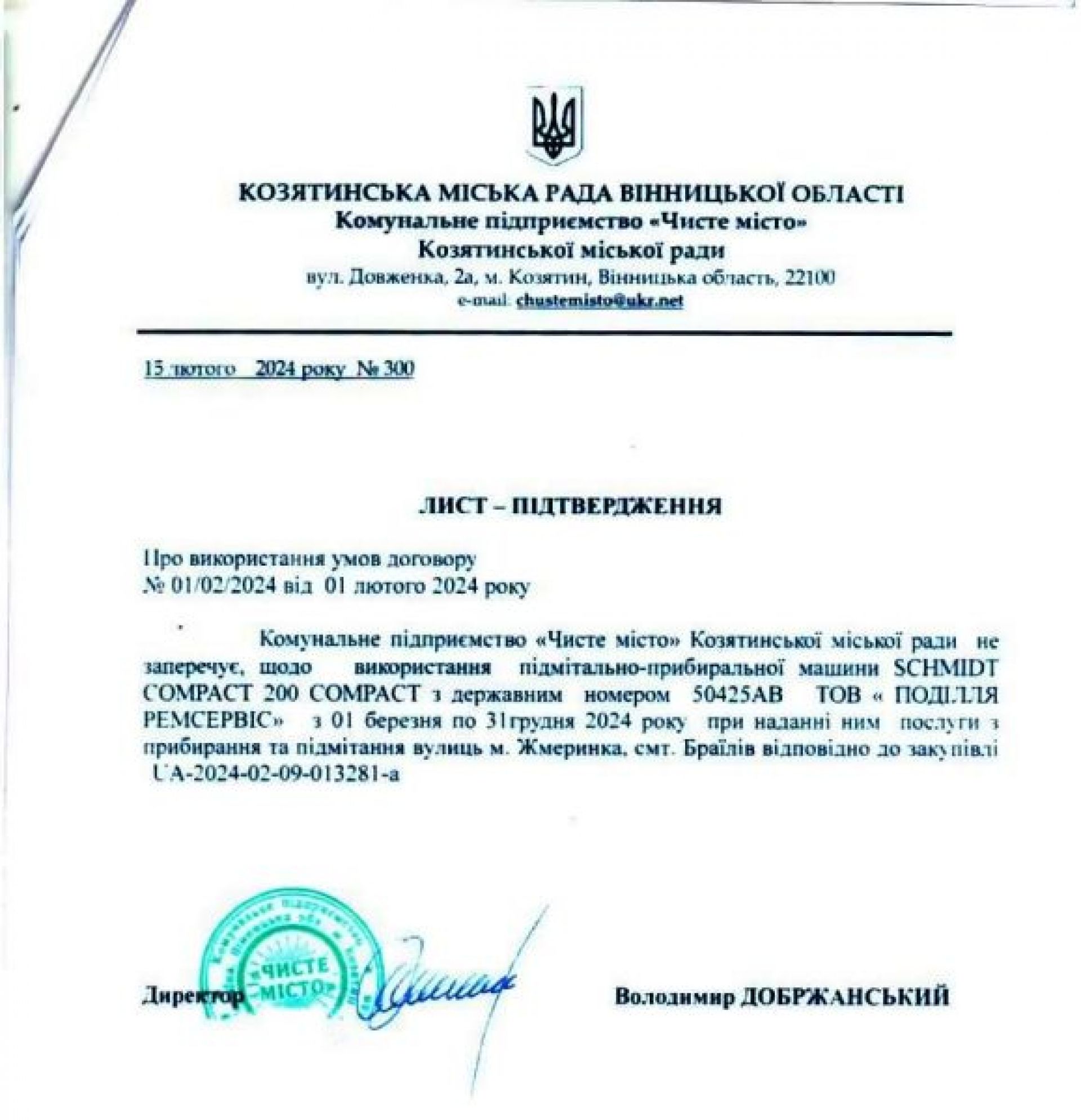 Участь у торгах брало чотири компанії: «Екосіті компані», «Ель Дорадо», «РемБудКолія» та «Поділля Ремсервіс». Остання, відповідно до тендерної документації, для виконання робіт мала брати у нашого «Чистого міста» прибирально-підмітальну машину. У довідці про наявність обладнання і матеріально-технічну базу серед техніки вказаний підмітально-прибиральний автомобіль Schmidt Compact 200, який належить комунальному підприємству «Чисте місто» і який «Поділля Ремсервіс» могло використовувати на підставі договору №01/02/2024 від 01.02.2024, а також лист-підтвердження, підписаний директором «Чистого міста», що комунальне підприємство не заперечує щодо використання цієї машини з 1 березня по 31 грудня 2024 року при наданні послуги з прибирання та підмітання вулиць у Жмеринці і Браїлові відповідно до вищевказаної закупівлі.
