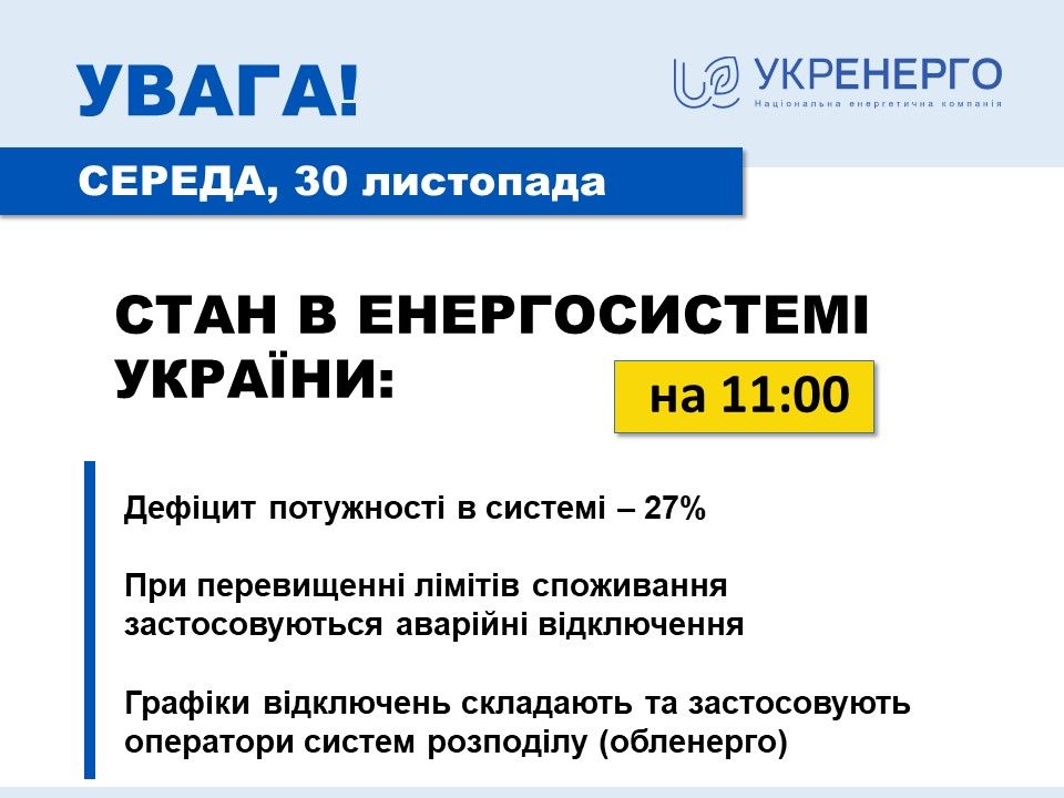 - Станом на 11:00 30 листопада виробники електроенергії забезпечують 73% споживання електроенергії в Україні. Дефіцит потужності складає 27%.
