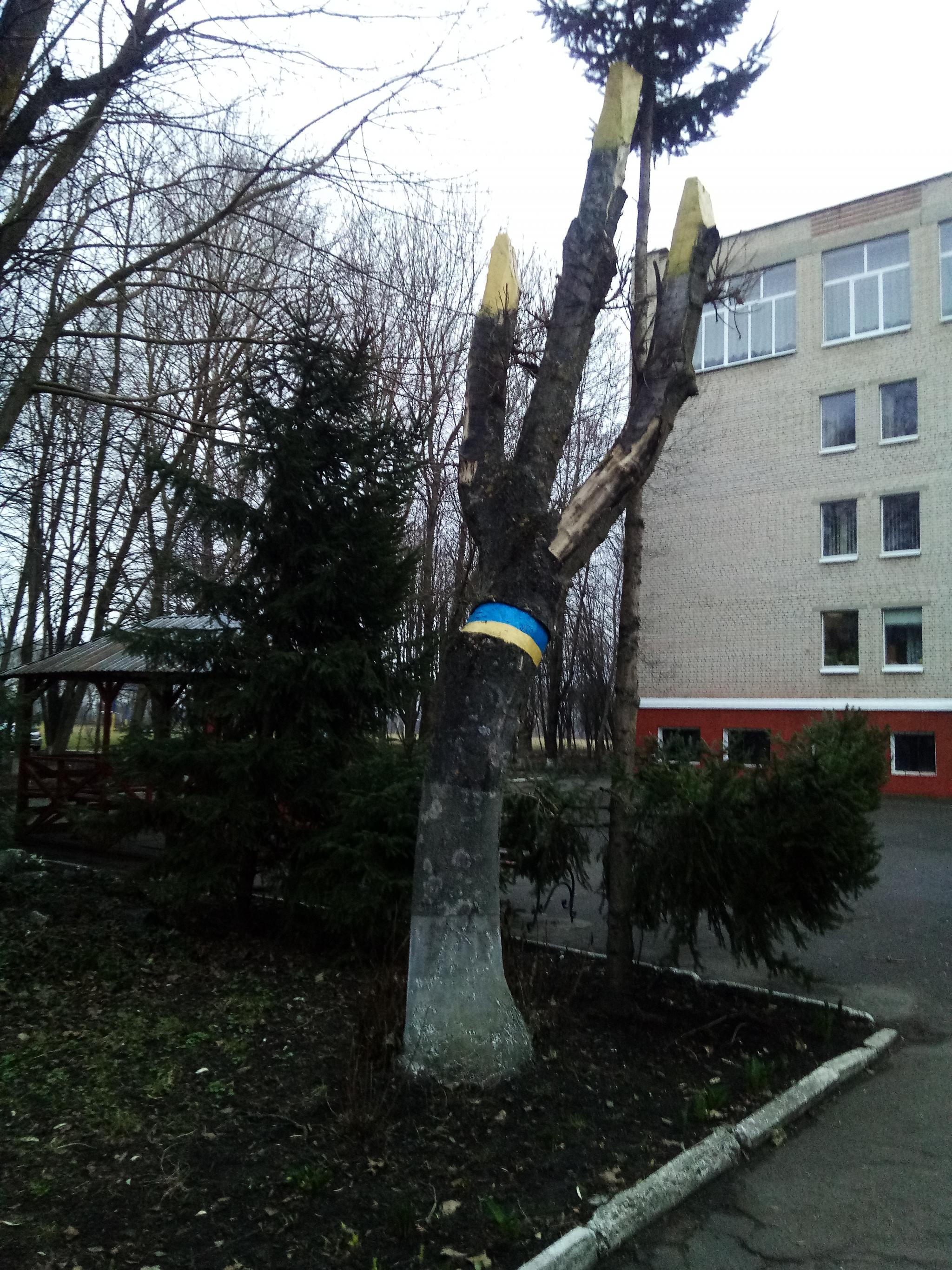 Гострі верхівки стовбурів дерева-тризуба пофарбували жовтою фарбою. А основу стовбура обрамляє жовто-блакитний пояс.