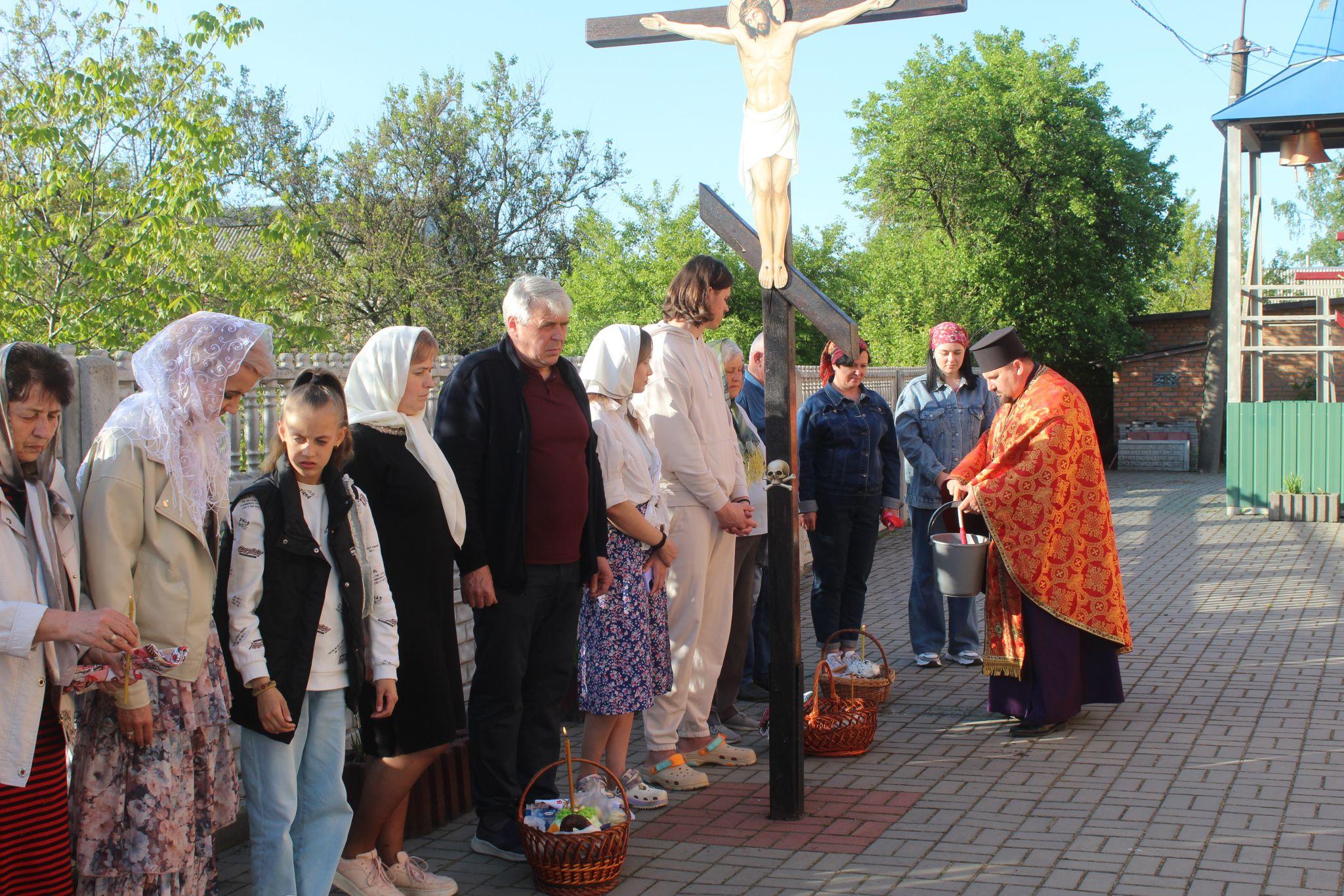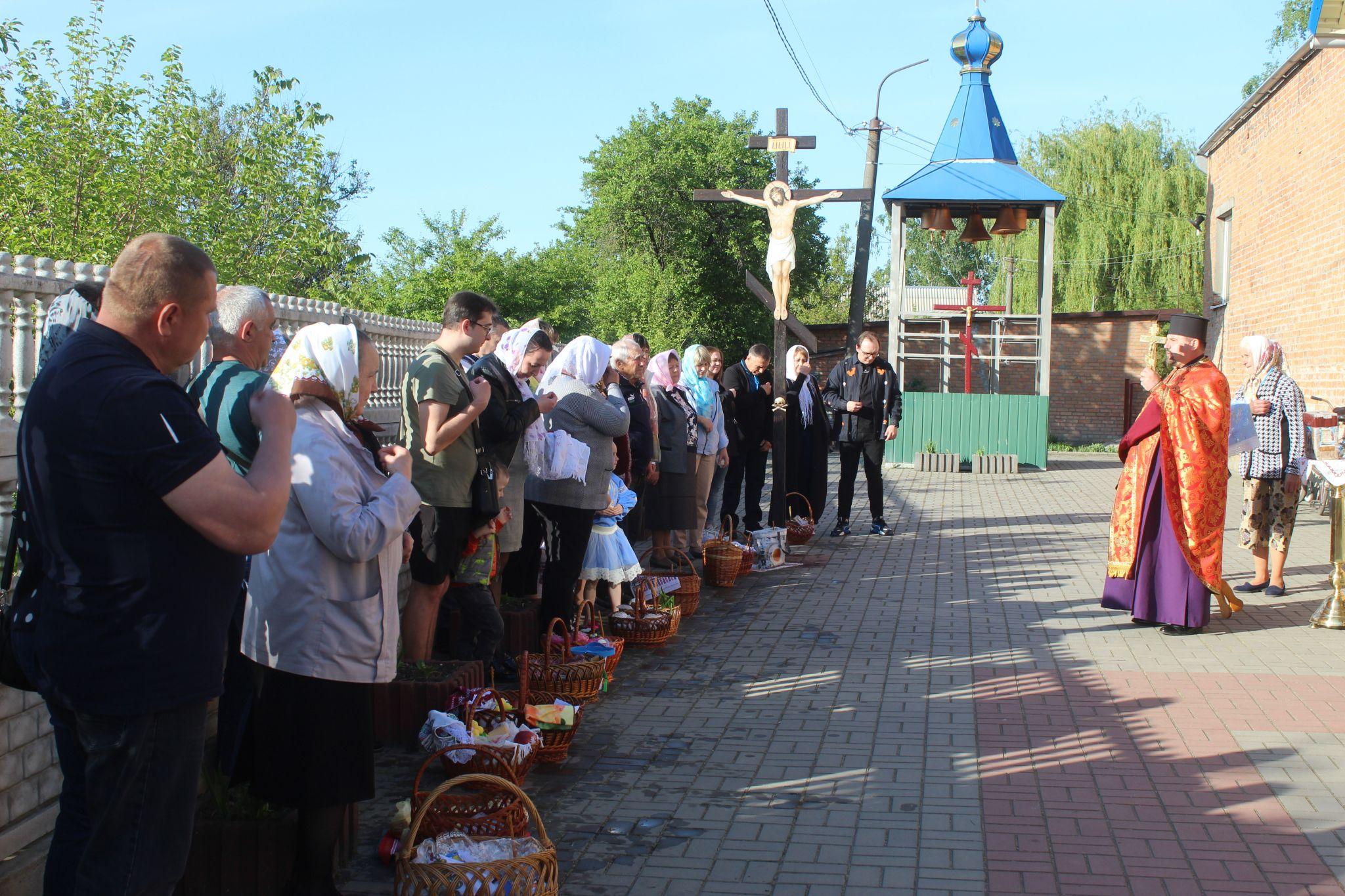 Свято Господнього воскресіння відзначають у Великодню неділю. Проте у нас вже третій рік через неадекватність сусіда в Україні діє комендантська година. Саме вона стала основною причиною, що освячення пасхальних кошиків відбувається в суботу перед Великоднем, а традиційне Богослужіння Всенічна розділене у часі: до комендантської години і ранкова після 5-ї в неділю. Московитам немає різниці по кому запускати ракети: чи то об’єкт інфраструктури, дитячий садочок чи храм. Щоб не було біля храму великого скупчення людей, священники проводять службу Божу і освячують паски невеликими групами людей. Так було у храмі Покрови Пресвятої Богородиці.