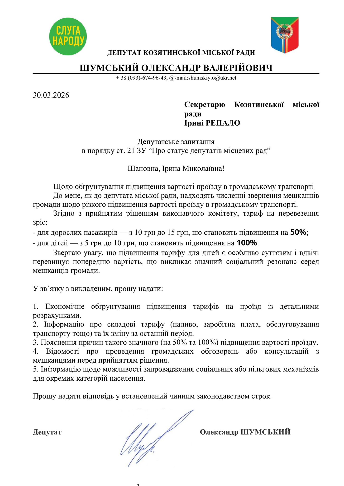 Днями депутат міської ради Олександр Шумський у себе на сторінці повідомив, що написав депутатське запитання секретареві міської ради з проханням надати економічне обгрунтування щодо підвищення тарифів на проїзд
