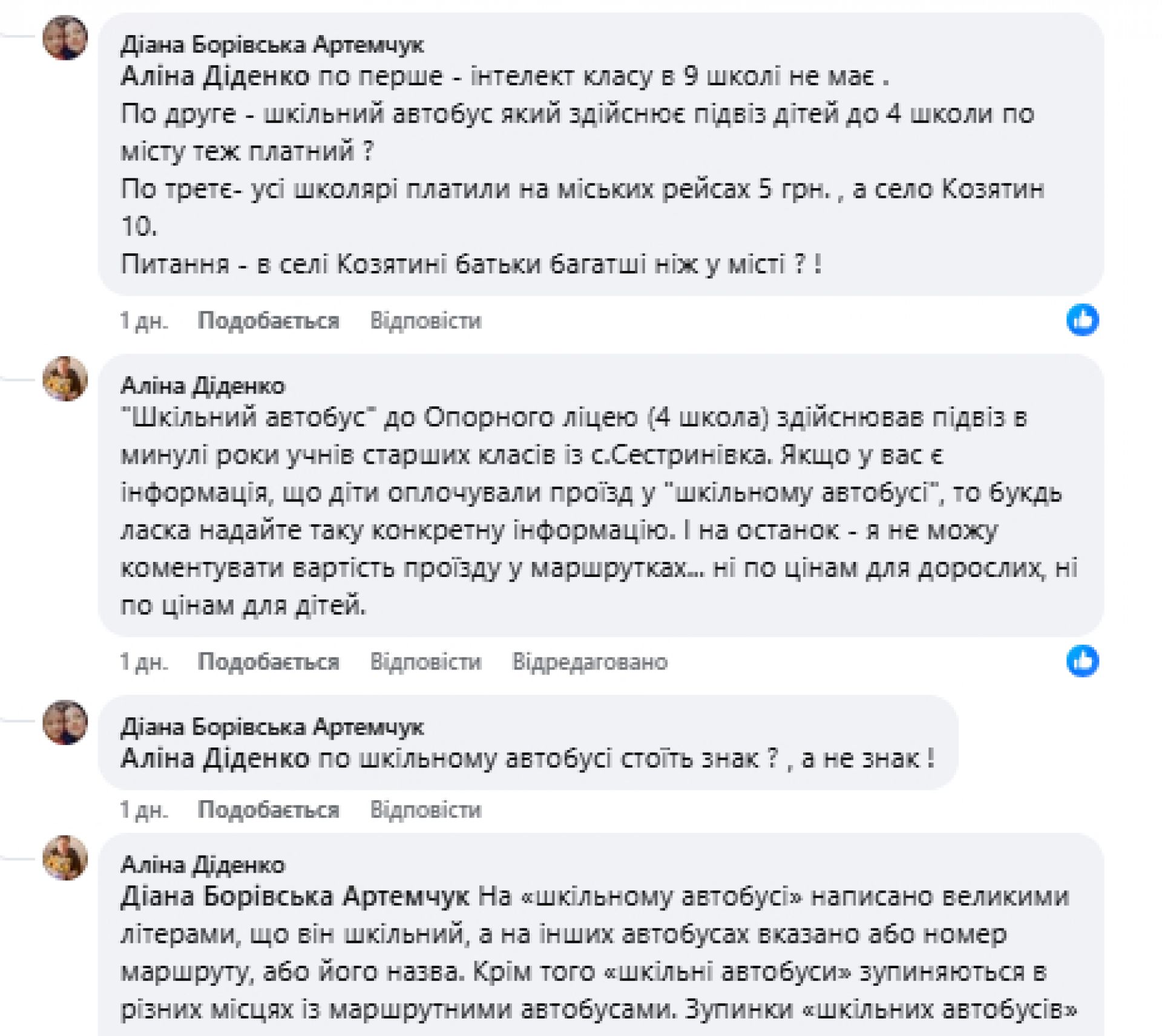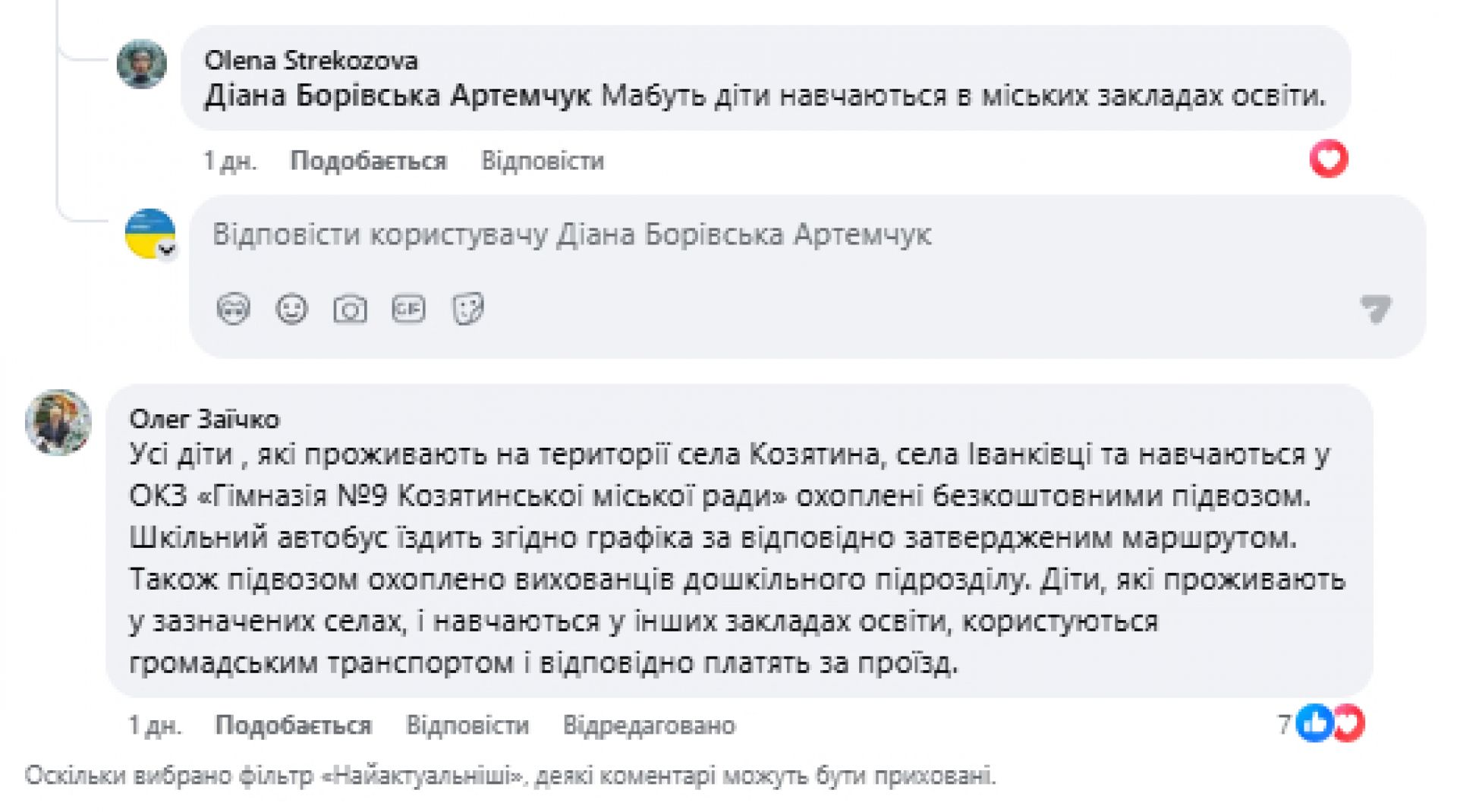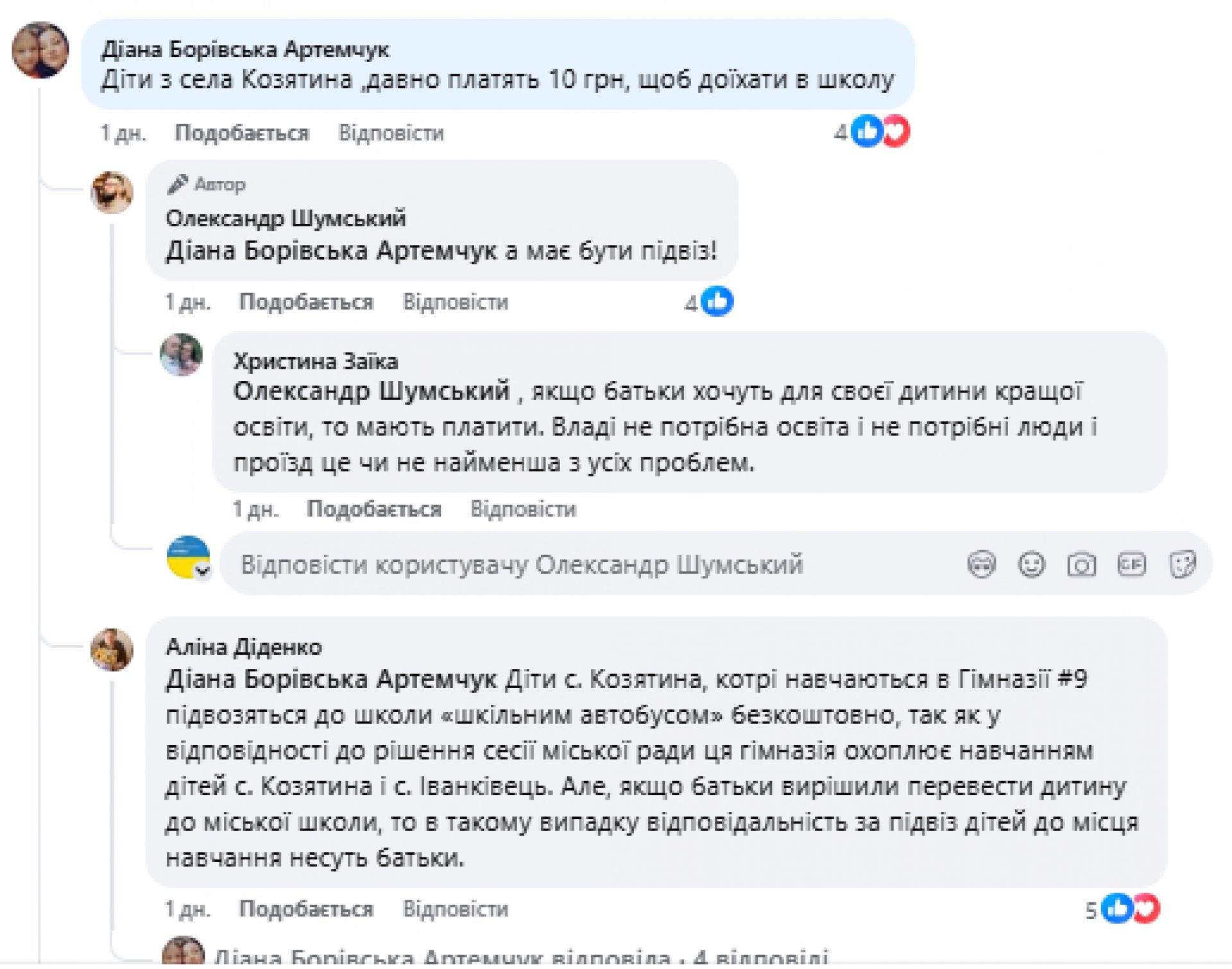 «В порівнянні з раніше встановленим тарифом зростання становить на 50% для дорослих та на 100% для дітей. Зростання тарифу для дітей на 5 гривень є суттєвим та створює додаткове навантаження на батьків. Під час військового стану, коли ми маємо підтримувати один одного Козятинська місцева влада робить все навпаки. Зрозуміло, що подорожчало пальне, але разом з тим маємо розробити механізми для підтримки місцевих жителів та тим більше дітей. Особисто для мене така ситуація є незрозумілою. В звʼязку з чим, як депутат міської ради, звернувся сьогодні з відповідним зверненням до керівництва громади» — написав Олександр.