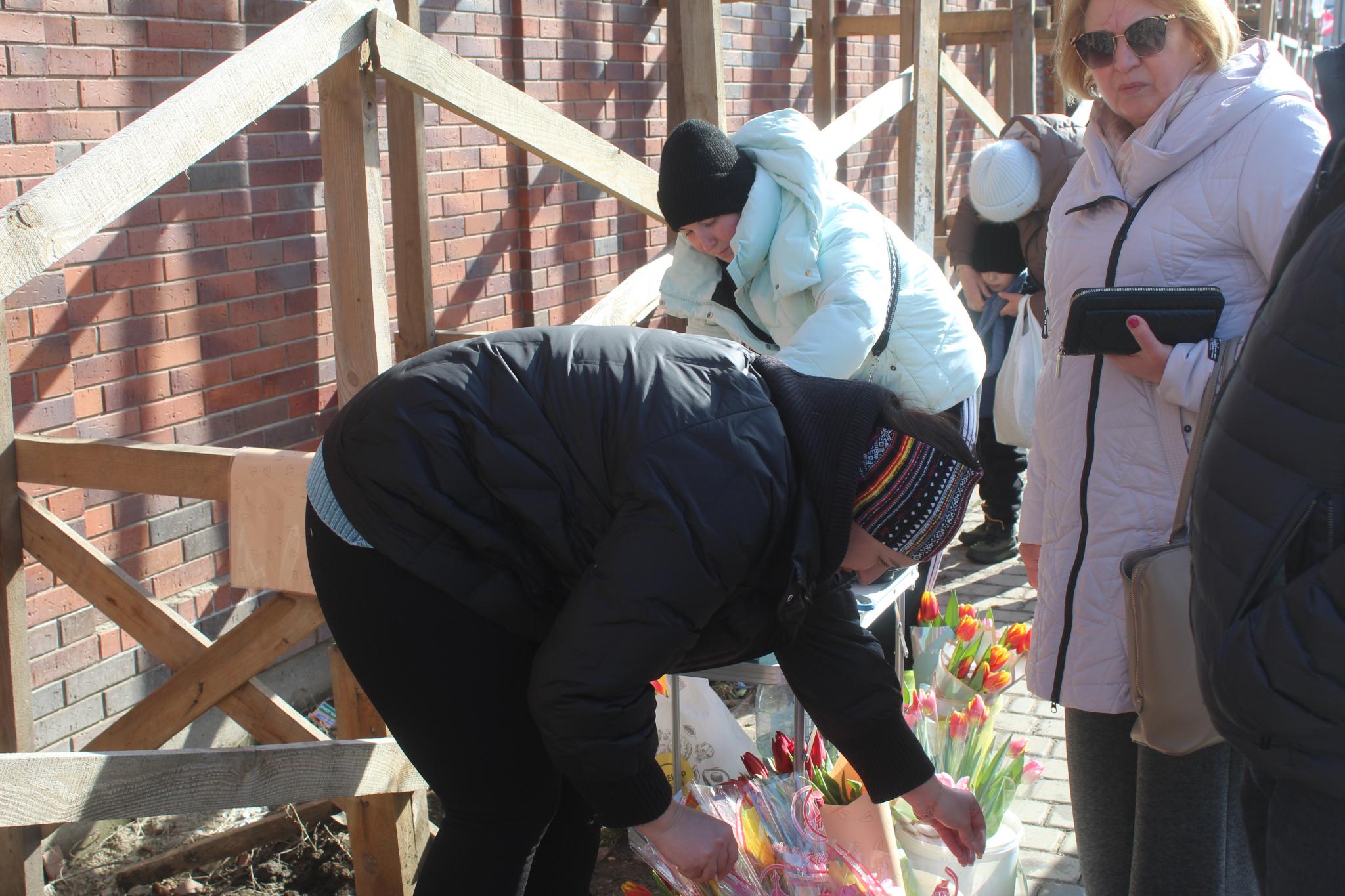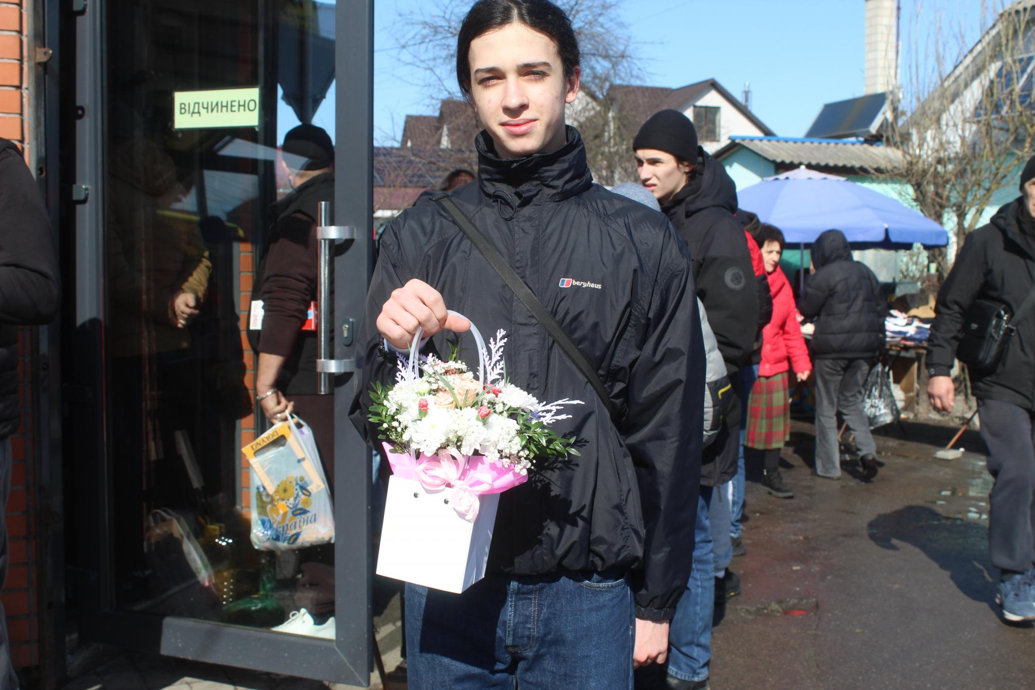 З самого ранку до квіткових точок важко було доступитись. Вже з букетами квітів ми зустріли Влада і Дашу. Вони купили букети, щоб привітати своїх мам. Найдешевші тюльпани можна було купити по 50 гривень за штуку. Найдорожчі продавали по 80 гривень. Найпопулярнішими квітами були тюльпани і троянди. При чому одна троянда за ціною дорівнювала мало не трьом тюльпанам. Наш земляк пан Петро віддав за три троянди внучці Катерині 450 гривень.